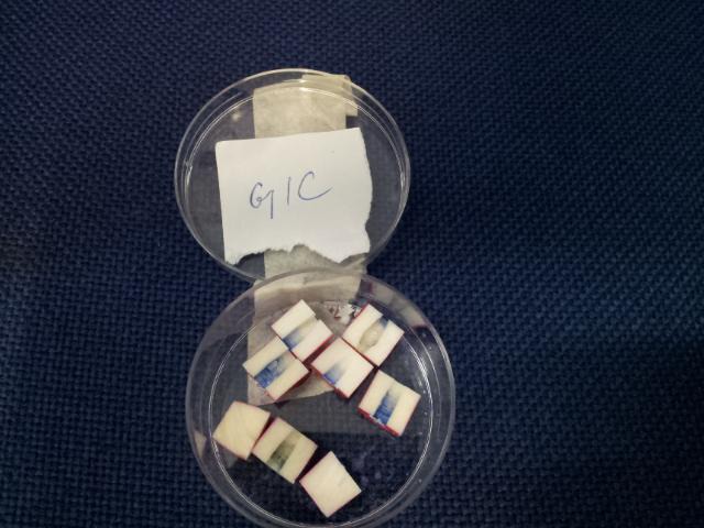 Objectives: To measure potential leakage at dentin/sealant interface. Methods: Total 16 elephant tusk dentine samples were cut in such a direction that the dentinal tubules were running in a horizontal direction. Samples were 10 mm long and 10 mm in diameter with canal of 3 mm in depth. Canals were prepared by barbed broaches under normal saline irrigation and then dried with paper points. Dentine samples were then divided into two groups with eight samples each. Mineral trioxide was mixed and dentine samples of group 1 were filled. Glass ionomer cement was then mixed and dentine samples of group 2 were filled. All the samples of group 1 and group 2 were left in the storage container for 24 hours to allow for effective setting of material. After 24 hours sample surfaces were coated with a double layer of nail varnish. Then prepared samples were suspended with the aid of dental floss in methylene blue dye 1% solution for 72 hours, at a constant temperature of 37 ̊C. Samples were suspended to allow easy penetration of dye solution through diffusion. Samples were not immersed fully into methylene blue dye solution because in this way a dye cannot penetrate properly. The coats of nail varnish were then removed by scraping it off with a scalpel blade. Then 8 dentine samples filled with mineral trioxide aggregate and 8 dentin samples filled with glass ionomer were embedded in impression compound and were cut longitudinally with a lathe cut machine and endodontic sealer was removed from canal. Each sample was examined under stereomicroscope to examine dye penetration. Dye penetration was than measured in millimeter (mm). Maximum point up to which dye penetrated on the sample was marked and measured remaining part of the sample in which dye did not penetrated.Paired ‘T’ test was used for statistical analysis to calculate the mean, standard deviation and p values. Results: Results of both groups showed that mineral trioxide aggregate showed more microleakage (more dye penetrated) than glass ionomer cement. Conclusions: Within the limitation of this study it has been concluded that both materials showed microleakage but glass ionomer cement showed less microleakage and good sealing ability as compare to mineral trioxide aggregate.