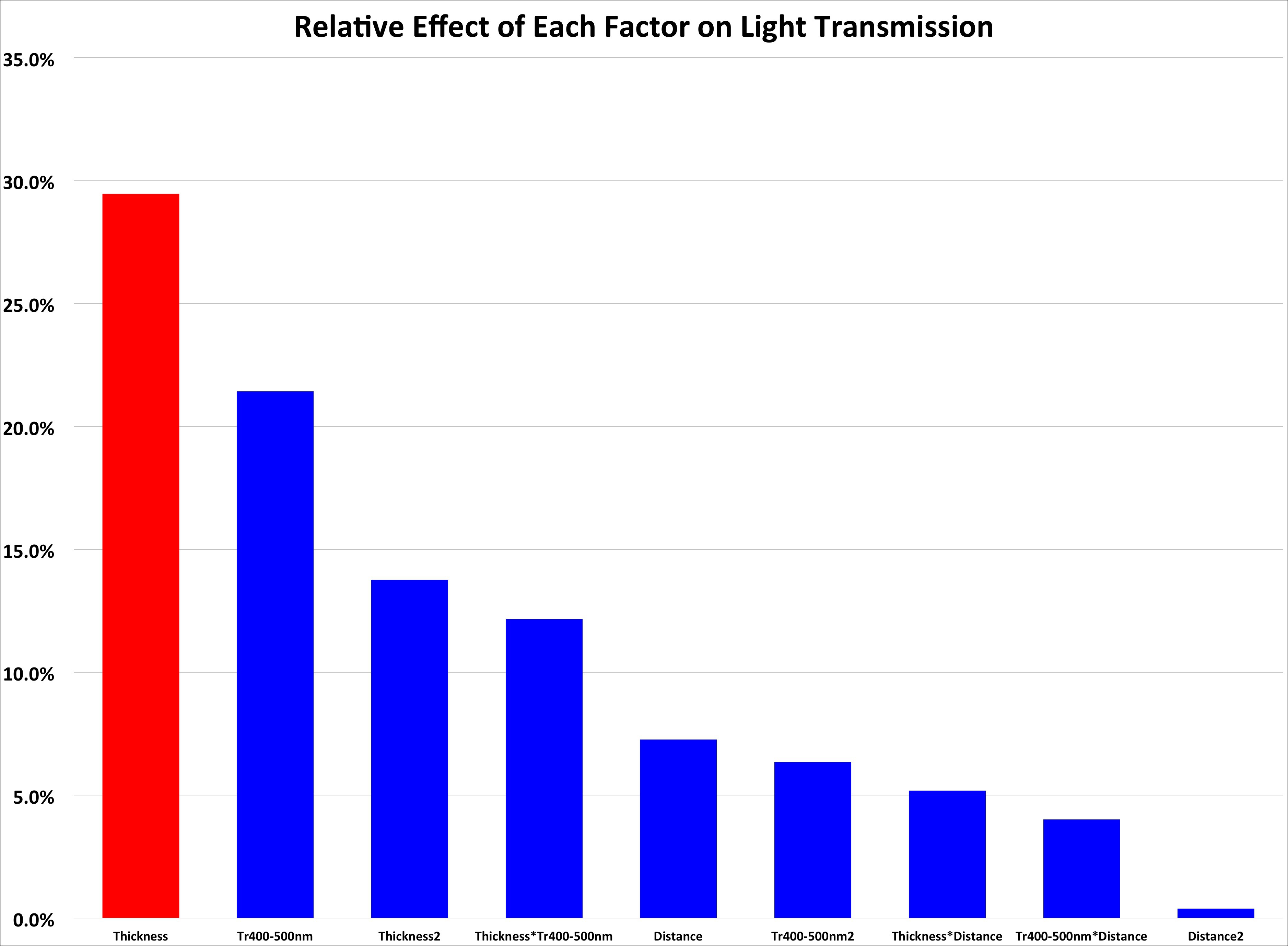 Objectives: Light activated resin based composites (RBC) must receive sufficient light in order to photopolymerize. Using response surface methodology, this study investigated the interaction of three factors that can affect the light transmission through the RBC during photocuring. Methods: To determine the effect of RBC thickness, transmittance between 400-500nm (Tr400-500nm) and distance between the curing light and the distance between light and the top of the RBC, a 3-factor multivariable experiment was designed using response surface methodology. Each factor was varied at 5 levels. Experimental RBCs were prepared with transmittance 400-500nm values that ranged from 40 to 70. The RBCs were cured using an Elipar S-10 curing light (3M ESPE) in metal molds that ranged in thickness from 2 to 6mm. The Elipar S-10 light guide was placed 0 to 8mm above the composite. The light transmission through the RBC as it was light cured was recorded in real time into an integrating sphere (Labsphere) and the irradiance beam profile (Ophir Spiricon) was collected at the bottom of each RBC. The Knoop microhardness was also measured immediately light curing and after 24 hours on selected specimens. Results: The data were analyzed by multivariable regression in coded units. A full polynomial model was used to analyze the data and the use of coded units allowed for the comparison of the magnitude of the impact each factor had on the model. The polynomial model describing the experimental space fit the data with an R2=99.9% and a P-value described the significance of each factor. Thickness of the RBC had the greatest impact when determining the amount of light transmitted through the RBC as it was light cured. This finding was supported by the Knoop microhardness results obtained from selected specimens. Conclusions: For the Elipar S10 curing light, the RBC thickness had the greatest impact on the amount of light transmitted through the RBC during light curing. The thickness was followed by Tr400-500nm > Thickness2 > Thickness*Tr400-500nm > Distance > Tr400-500nm2 > Thickness*Distance> Tr400-500nm*Distance >> Distance. Lights that deliver less homogeneous beam profiles may produce different results.