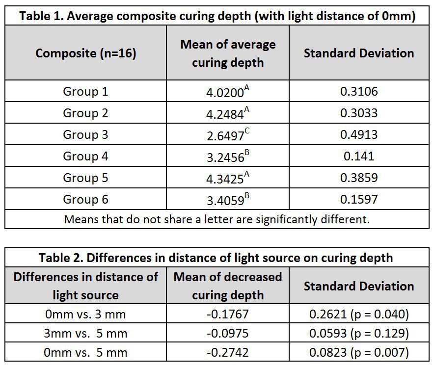 Objectives: To compare and evaluate the effect of curing distances on the polymerization of several bulk-fill composites at clinically relevant distances using two different curing lights. Methods: Sample groups (n=16) of composites from Group 1[Experimental Flow (Dentsply Caulk)], Group 2[Experimental Posterior Bulkfill (Dentsply Caulk)], Group 3[Experimental posterior universal (Dentsply Caulk)], Group 4[SonicFillTM (Kerr)], Group 5[Surefil SDR® (Dentsply Caulk)], Group 6[Tetric EvoCeram Bulkfill® (Ivoclar Vivadent)] were placed in custom molds and light cured at distances of 0, 3, and 5mm with the help of the Marc resin calibrator using the ISO 4049 test method. The remaining hard composite length was measured with a digital micrometer and the value was divided by two per ISO 4049 protocol. Each sub-group (n=8) tested two different curing lights: Light 1[DemiTM Ultra Plus (Kerr)] and Light 2[SmartLite Focus (Dentsply Caulk)]. Analysis was conducted by one-way ANOVA and Tukey test at 95% confidence interval. Significance was determined with p<0.05. Results: Among bulk-fills with the light at 0 mm distance, groups 1, 2, and 5 had a statistically significant greater mean of average curing depth than groups 4 and 6. Group 5 had the highest average mean curing depth while group 4 showed the lowest mean of the bulk-fills(Table 1). The depth of cure had the largest drop when comparing the light source from 0mm to 5mm and the smallest decrease when comparing the light source from 3mm to 5mm(Table 2). Conclusions: Among bulk-fills, groups 1, 2, and 5 had higher curability than groups 4 and 6. While group 3, the control group, was statistically different from all other groups, with a lower mean. This was as expected since it is not bulk-fill composite. The depth of cure based on distance showed predictable results; the further away the light source was from the composite, the less the composite was polymerized.