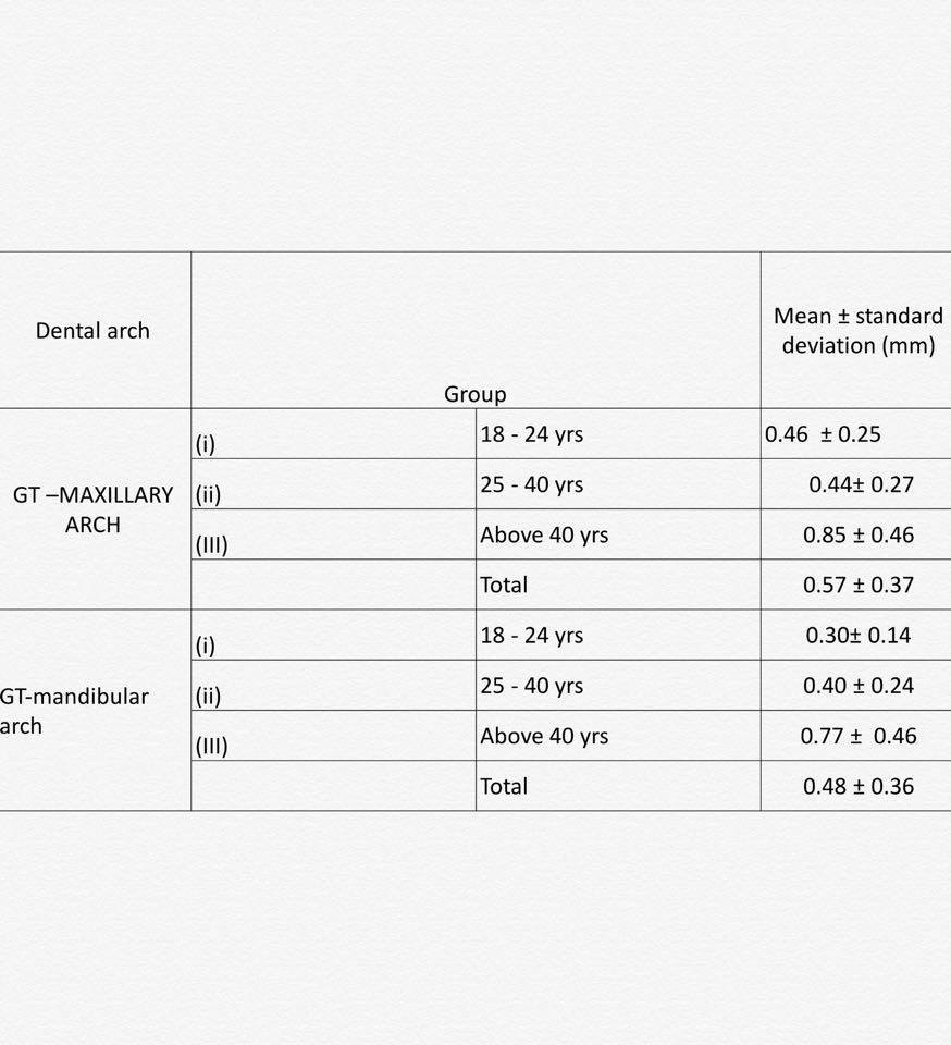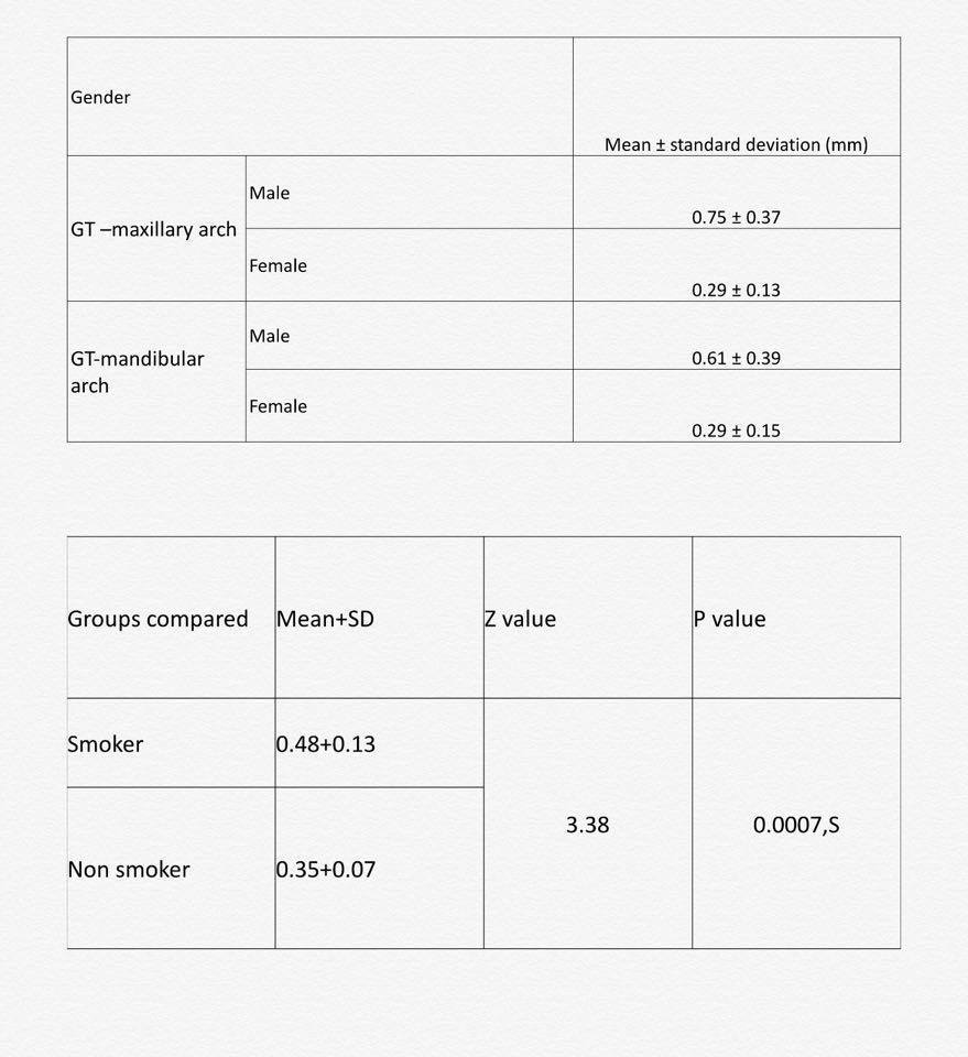 Objectives: To evaluate the variation in the gingival thickness with regards to age, gender, smoking status and its location in the dental arch Methods: 100 subjects including both males and females , smokers and non smokers of various age groups ranging from 18-60 years were examined . Under topical anesthesia, the facial gingival thickness was measured by transgingival probing (TGP) using an endodontic reamer in the anterior teeth region of both the arches. Results: The 100 subjects in the study were divided into three age groups , group (i) :18-24 years , group (ii) : 24-45 years , group (iii) >45 years . They were subdivided into males and females , and males were further divided into smokers and non smokers .The gingival thickness for the three age groups when compared , significant differences were found in between the age groups (i) and (iii) (p=0.038) and groups(ii) and (iii) (p=0.019) for the maxillary arch . And for the mandibular arch, significant difference was found in between the age groups (i) and (iii) (p=0.005) and group (ii) and (iii) (p=0.019) .The gingival thickness was more in males when compared with the females in the maxillary arch (p=0.014) and in the mandibular arch (p=0.004) The gingival thickness of the maxillary arch is comparatively greater than the mandibular arch. The comparison of midbuccal gingival thickness among smokers and non-smokers, which shows that midbuccal thickness in smokers is higher than in non-smoker group (p= 0.0007) Conclusions: The gingival thickness of the patients in varying age groups was found to be increasing with the increasing age, and it was thicker in males when compared with the females , the thickness was higher in maxillary arch than the mandibular arch. And thickness was increased in smokers than the non smokers