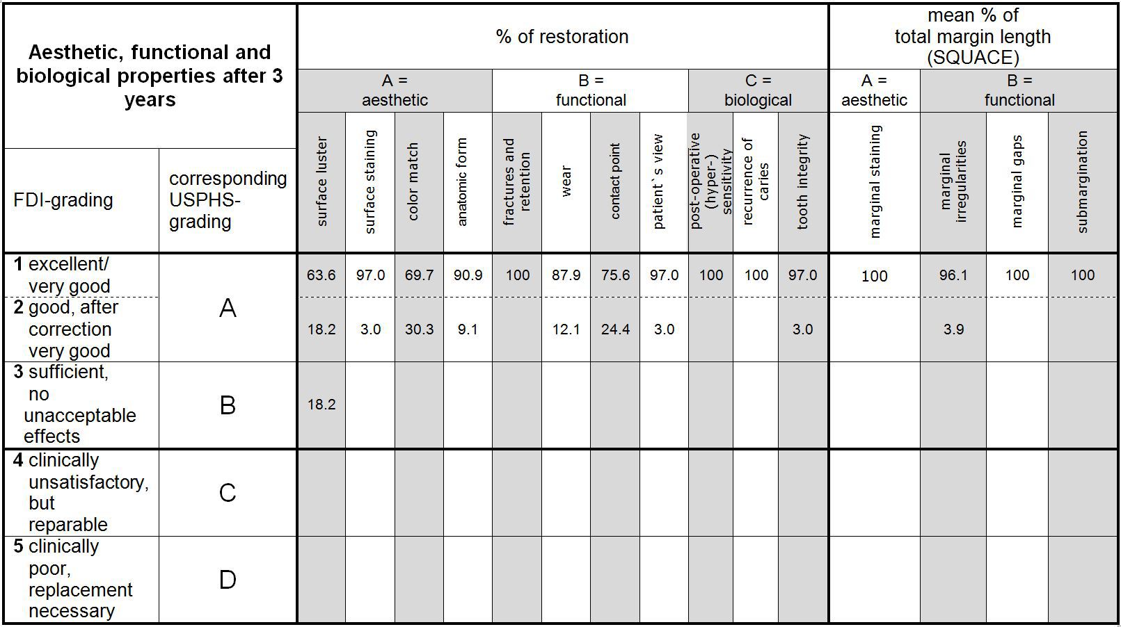 Objectives: The aim of this prospective clinical trial was to evaluate the clinical performance of the bulk fill composite Tetric EvoCeram Bulk Fill (Ivoclar Vivadent) in posterior cavities in combination with an experimental adhesive using selected FDI criteria and a semi-quantitative clinical evaluation method (SQUACE). Methods: A total of 35 cavities (14 Class I and 21 Class II; 25 in molars, 10 in premolars) were restored with Tetric EvoCeram Bulk Fill using an experimental self-etch adhesive after conditioning with phosphoric acid. Restorations were placed in 28 subjects by three experienced clinicians. The follow-up examinations took place after 1 week (baseline), 1, 2 and 3 years. Two drop-outs were recorded after one year due to a change of residence. After 3 years, 33 (94%) restorations were assessed by means of selected FDI-criteria for the evaluation of direct restorations (Hickel et al. 2007). The FDI-criteria included the evaluation of aesthetic, functional and biological properties. Criteria concerning the restorations’ marginal quality were semi-quantitatively evaluated as % of total margin length (SQUACE method). Results: After 3 years, 100% of the restorations that were available for evaluation were still in place and the majority of them were graded either “excellent” or “good”. Documented marginal flaws affected only small portions of the total margin length (96.1% "perfect", 3.9% "good") and none of the cases examined showed marginal discolorations. Although the system comes in only three universal shades (IVA, IVB, IVW) the restorations exhibited a perfect color match in 69.7% of the cases and a "good" aesthetic integration in 30.3% of the restorations. Surface luster was still "perfect" in 63.3% of the cases. Minor loss of gloss or surface porosities were predominantly limited to occlusal contact areas and the surface was still rated "good" in 18.2% of the cases and "sufficient" in 18.2% of the restorations. More details are shown in Table 1. Conclusions: Tetric EvoCeram Bulk Fill shows a reliable clinical performance over 3 years without any failures, excellent margin quality and favorable aesthetic integration.