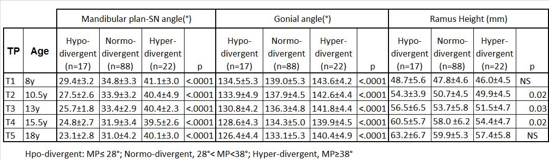 Objectives: To examine the craniofacial morphological characteristics of different facial types based on vertical dysplasia in untreated subjects from the ages of 8 to 18. Methods: 127 subjects with longitudinal lateral cephalograms at least three time points, 7 to 18 years available from the AAOF Legacy Collection were categorized into three groups: hypo-, normo-, and hyper-divergent facial types based on Mandibular plane to SN angle (MPA) values at the mean age of 12.98±0.65years. Results: The hyper-divergent facial type showed significantly more retrusive maxillary and mandibular positions relative to the cranial base compared to the normo- and hypo-divergent facial types; however, no differences were found in ANB angle. Gonial angle showed statistically significant differences among the three facial types (Table). The ramus height was statistically greater in the hypo-divergent facial type between the mean ages of 10.5 to 15.5, whereas no differences were found in the mandibular body length (Go-Pog) and Condylion-Pogonion distance among the three groups. The differences in total anterior facial height (N-Me) and lower facial height (ANS-Me) were statistically significant from the age of 8, but the actual changes were not statistically different. Decreases in MPA and gonial angle were significantly greater in the hypo-divergent group than the hyper-divergent group between the ages of 8 and 15.5. Conclusions: Significantly different craniofacial morphological characteristics were found for three different facial types based on vertical skeletal dysplasia. These characteristics seem to be established early and continued to develop in the same pattern. Major morphological differences were found in gonial angle and ramus height among the three facial types.