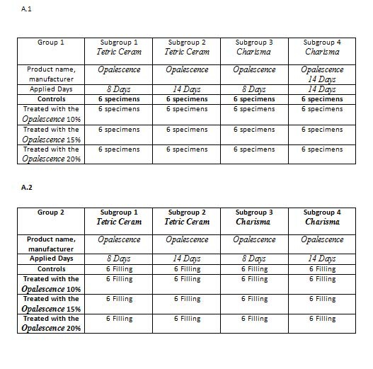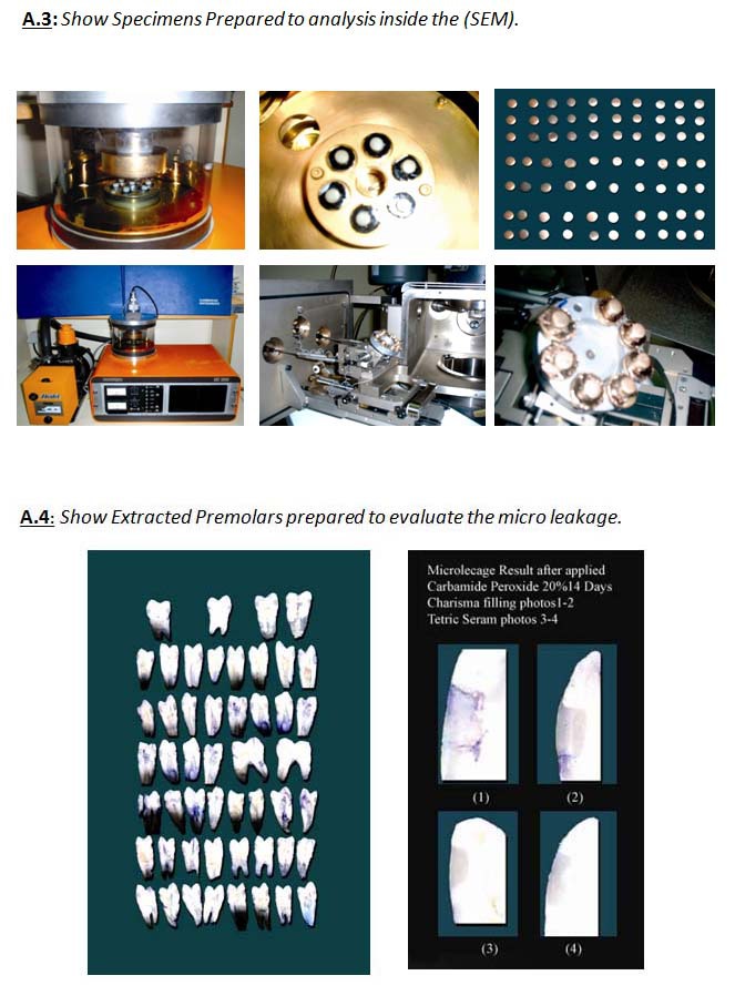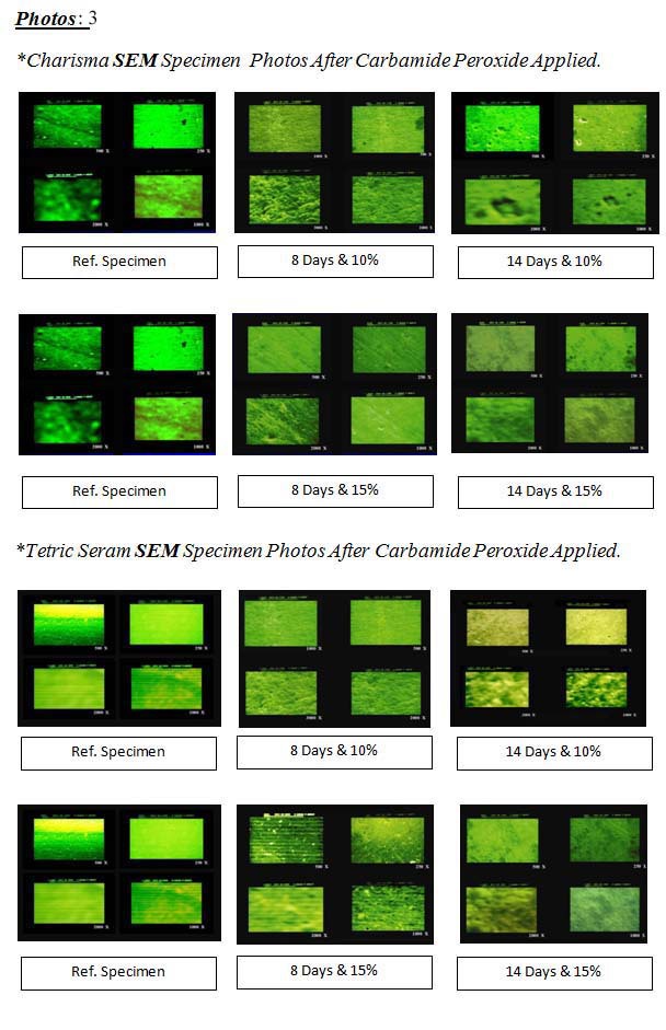 Objectives: The aim of this study was to evaluate the effect of bleaching gel containing different concentrations of Carbamide Peroxide on tow composite material according two points of view: Surface morphology of composite restoration by using scanning electron microscope (SEM). Microleakage of class V cavities restored with mentioned Composite Methods: The following material was used: Composite : Tetric Ceram and Charisma Bleaching Gel: Opalescence 10-15-20% Two samples were prepared: Group1: included 96 tablets of 6mm in diameter, 3mm in thickness divided into four subgroups each containing 24 specimens of mentioned restorative material according to the concentration of bleaching agent and period of a administration. Photo1 (A.1) Group2: including 96 freshly extracted human premolars. GlassV standardized cavities 2X4 mm were prepared on facial surfaces divided into the mentioned restorative materials according to the concentration and period of administration of the bleaching gel.Photo1(A.2) The two groups treated with the bleaching agent 8 hours for 8 &14 days. Six specimens of tablets and six of premolars were used as controls for each restorative material. The tablets were analyzed by SEM, Photos 2 (A.3) Premolars were studied after thermo cycling, immersion in 0.5% tuliden blue solution for 24 hours, and sectioning longitudinally in faciolingual direction, by stereomicroscope. Photos 2 (A.4) Results: The SME analysis revealed differences between the surface morphology of specimens treated with bleaching gels and control specimens. And its more detectable when the concentrations of bleaching gel and period of applying is increased. Where an obvious degradation in matrix was noticed, and the glass particles were exposed increasing surface roughness, where the matrix surrounded fully the filler particles of the control Photos 3 Statistical analysis using T student test (P=0.05) of the specimens studied to measure the degree of Microleakage showed. Significant differences were noticed between control specimens and treated specimens. Degree of microleakage increases when concentration increases. No significant differences were noticed between 14 dyes group & 8 days group. Conclusions: This study show, treatment of composites with bleaching agents containing carbmide peroxide leads to increase in surface roughness and microleakage.