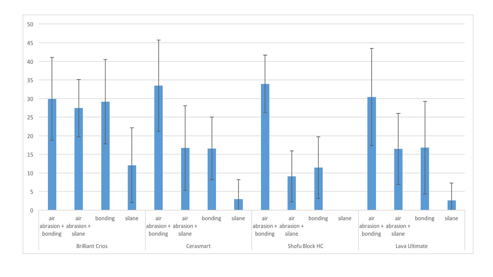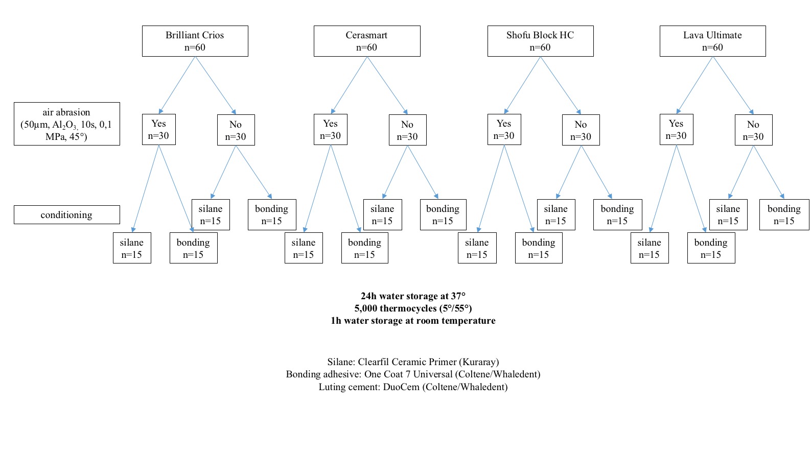 Objectives: The objective of this study was to investigate the tensile bond strength between four different CAD/CAM composites and one resin composite cement with and without air abrasion and using either silane or a bonding adhesive. Methods: Four different CAD/CAM composites were tested: i. Brilliant Crios (Coltene), ii. Cerasmart (GC Europe), iii. Shofu Block HC (Shofu) and iv. Lava Ultimate (3M) and a resin composite cement (DuoCem, Coltene). Of each CAD/CAM material 60 specimens were prepared (N=240) and divided into two groups (n=30). One group was air abraded for 10 seconds (Al2O3, 50 µm, pressure 0.1 MP). Each CAD/CAM group was further divided into 2 subgroups (n=15) and conditioned with either silane (Clearfil Ceramic Primer, Kuraray) or bonding adhesive (One Coat 7 Universal, Coltene/Whaledent). After the conditioning, a PMMA-cylinder was placed on the conditioned surface and filled with resin composite cement (DuoCem, Coltene). After light polymerization a thermocycling process (5,000 cycles between 5°C and 55°C) was performed. For tensile bond strength measurements, an universal machine was used (Zwick 1445). The data was analyzed using Kolmogorov-Smirnov test, general linear model analysis, Chi2-test, Kaplan–Meier survival estimates, and Breslow–Gehan tests (p<0.05). Results: The highest influence on the bond strength was exerted by the use of bonding adhesive (partial eta squared ηP2 = 0.383, p<0.001) followed by the air abrasion (ηP2 = 0.355, p<0.001), and the use of the CAD/CAM composite (ηP2 = 0.178, p<0.001). The additional air abrasion step increased the tensile bond strength values. Specimens conditioned using a bonding adhesive showed higher bond strength than these conditioned using silane. Conclusions: Airabrasion and the use of a bonding adhesive seems to be the best pretreatment strategy to create a reliable bond between the CAD/CAM composite and resin cement. In general, it can be stated, that the measurements in combination with the CAD/CAM block Brilliant Crios showed higher tensile bond strength values compared to the remaining CAD/CAM blocks. This may lead to the assumption that there are more free carbon-carbon-double binds on the surface of Brilliant Crios than on the other materials. More clinical research is mandatory to further investigate the performance of CAD/CAM resin composites.