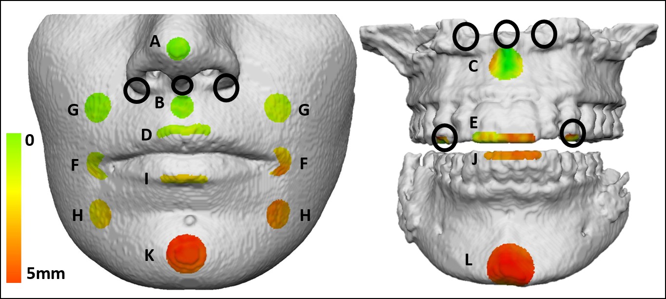 Objectives: The purpose of this pilot study was to test reliability of a new method to evaluate orthognathic surgery outcomes and, secondarily, to understand the effect of hard tissue changes on soft tissue displacement. Methods: The sample consisted of eight patients who underwent bimaxillary advancement and had CBCT at two time points (before surgery and 6-8 months follow-up). Voxel-based cranial base superimposition was used to register the scans. Three-dimensional surface models were created and a different technique of iterative closest point, which focused on areas rather than specific landmarks, was used to measure and correlate the changes. Imagine and ITK-Snap (both NIH funded) were used to perform the superimposition and create the surface models, respectively. VAM (Canfield Scientific, Fairfield, NJ) was used to perform the measurements. The average displacements of 15 areas (4 hard tissue and 11 soft tissue, figure 1) were measured twice after a one-month washout period. Intraclass correlation coefficient (ICC) was done to test the measurements’ reproducibility and Spearman rank correlation was used to correlate the hard and soft tissue changes. The correlation was divided between maxillary and mandibular areas. Significance was set at p<0.05. Results: ICC was >.99 for all measurements. Tables 1 and 2 show the correlation between hard and soft tissue changes for the upper and lower jaw, respectively. Changes of the tip of the nose did not correlate with changes in any maxillary area, whereas soft tissue A point, A point and upper lips had correlation with several areas. The highest correlation for the maxilla was between the upper lip and the left/right supra cheilion (p<.01, r=.91 and p<.01, r=.93, respectively). In the mandible, very few areas were correlated and the majority of them involved soft tissue pogonion, pogonion and lower incisors with the strongest between pogonion and lower incisors (p<.01, r=.98). Conclusions: The method showed high reproducibility for the measurements. The correlation found in this and future studies with greater sample sizes can help to predict the soft tissue outcomes of orthodontic-surgical therapies and aid professionals in developing goal-oriented treatment plans.