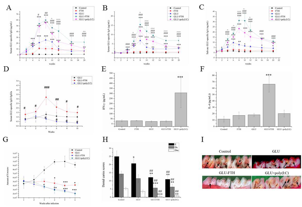 Objectives: Although anti-caries vaccines have been studied for decades, enhancing the salivary IgA antibody response through mucosal immunization is still a significant challenge. In severe infections caused by S. mutans infection compared with those of the present study, the levels of specific IgA against Antigen I/II (PAc) or glucan-binding regions (GLU) did not simultaneously increase. Thus, the development of anti-caries vaccines is a high priority for preventing dental caries. Methods: In the present study, we screened the PAc epitopes and GLU epitopes of streptococcus mutans by bioinformatics which based on the established scientific research platform. We took advantage of the self-assembling function of ferritin by linking the novel epitopic regions from PAc or GLU to the N-terminal exposed area of cage-shaped ferritin. Transmission electron micrographic images were used for the characterization of the novel nanoparticles. We used female BALB/c mice to evaluate the ability of nanoparticles for inducing specific mucosal and systemic responses. Furthermore, the protective efficiency against caries formation in female weanling Wistar rats following intranasal immunization with nanoparticles was compared with the previous anti-caries vaccines we have explored. Further, we evaluated in vitro the phagocytosis of nanoparticles by DCs as well as the ability of nanoparticles to enhance their maturation. Results: Transmission electron micrographic images of the purified proteins revealed a hollow spherical architecture with a narrow size distribution. Nasal immunization of the novel vaccines induced specific immune reponses and promoted a Th2-biased immune response. In the rat caries model, novel nanoparticles immunization achieved lower caries scores compared with rats immunized with the other vaccine groups. Moreover, the administration of nanoparticles enhanced dendritic cell phagocytosis and maturation. Conclusions: In summary, the rational design, structural analysis, antigenic profiling, and analyses of the systemic or mucosal immune response presented here establish a novel array of nanoparticles, with potential to serve as components of highly effective anticaries mucosal vaccines.We believe that our findings will inspire a strategy for developing specific mucosal vaccines for other infectious diseases.