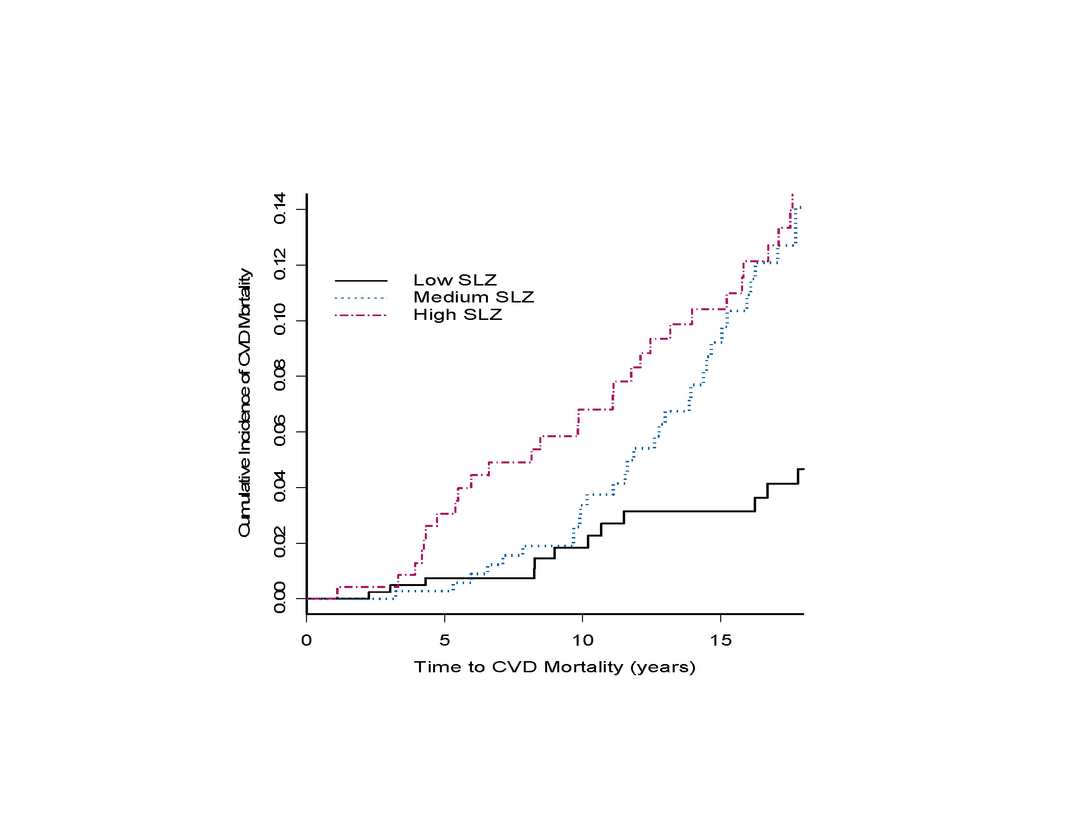 Methods: The data on 471 subjects participating in Kuopio Oral Health and Heart study without any missing values were analyzed utilizing proportional hazard regression methods to examine the association between baseline SLZ and CVD mortality (median follow-up=18.8 years). of the We divided the whole cohort by the SLZ levels into tertiles and the mortality associated with the third tertile was compared to that of the reference group. As the data dictated, the two lower tertiles comprised the reference group. We adjusted established confounders such as age, sex, smoking status, hypertension, diabetes, Total/HDL cholesterol ratio, and income. We additionally adjusted for CRP to control for the non-infectious inflammation from metabolism.