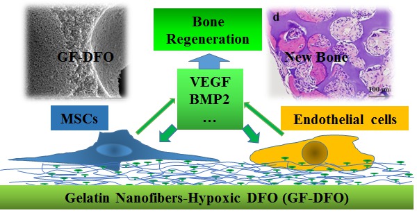 Objectives: Bio-mimetic materials that potentiate endogenous cells or signals to promote bone formation are superior to relying on exogenous cells or signals. Hypoxia promotes bone healing and Deferoxamine (DFO), which is a hypoxia-mimetic agent that chelates Fe3+, encourages healing. However, high cytotoxicity, off-target effects, and short half-life of DFO has significantly impeded its further applications. In the present work, our central hypothesis is that the covalent conjugation of DFO with a polymeric scaffold can decrease its toxicity and elongate its half-life time, and promote bone tissue regeneration through locally activating endogenous hypoxia mediated-angiogenesis and potentially other reparative cells and signals. Methods: Both 2D and 3D NF-gelatin scaffolds were prepared using thermally induced phase separation (TIPS) method with particle leaching technique (TIPS&P). DFO with different concentrations was crosslinked to NF scaffolds through EDC chemistry. The morphology and microstructure of 2D and 3D GF scaffolds were studied by using Quanta standard Environmental SEM. The cytotoxicity of GF, GF-DFO scaffolds on HUVECs and hMSCs was studied by using MTS assay. The morphologies scaffolds were visualized under the confocal microscopy.The amount of VEGF and BMP2 in supernatant were measured by using human VEGF and human BMP2 ELISA kit. Inbred C57BL/6NHsd male mice were used to create critical-sized cranial bone defect model for in vivo study. Sterile GF and GF-DFO scaffolds (Φ5 mm×1 mm) were directly placed in the cranial defects for 6 weeks and bone formation was analysis by X-ray and histological quantifications. Results: Our data indicated that DFO-functionalized GF (GF-DFO) scaffolds, with similar micro/macro structures with GF scaffolds, not only demonstrated decreased cytotoxicity on both HUVEC and hMSC, but also significantly increased VEGF expression in vitro. Most importantly, our in vivo experiments in a critical-sized mouse cranial bone defect model showed significant bone growth in most of the GF-DFO scaffolds after 6 weeks, while very little bone growth as observed in the GF scaffolds. Conclusions: These encouraging data suggested that it is a promising strategy to promote endogenous bone formation by using a hypoxia-mimicking nanofibrous scaffold.
