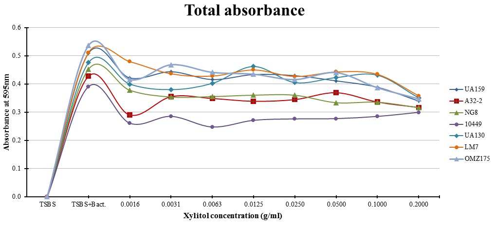 Objectives: The objective of this study was to investigate the affect of xylitol on the viability and biofilm formation of seven S. muatns strains. Methods: Seven Streptococcus mutans strains (UA159, UA130, NG8, LM7, A32-2, OMZ175, and 10449) were cultured in a tryptic soy broth (TSB) solution for 24 hours in 5% CO2 incubator at 37°C. Eight concentrations (0.2, 0.1, 0.05, 0.025, 0.0125, 0.0063, 0.0031, 0.016g/mL) of xylitol with tryptic soy broth with sucrose (TSBS) were prepared through serial dilution. Sterile 96-well flat-bottom polystyrene microtiter plates were utilized and 10μL of each strain inoculum was added in each well. Microtitre plates were incubated for 24 hours and absorbance readings were recorded using a spectrophotometer. Resultant biofilms were fixed by adding 200 μL of 10% formaldehyde. Crystal violet solution was added after washing followed by 200μL Isopropanol. Biofilm absorbance readings were measured at 595nm wavelength. Two strains (10449 and A32-2) were further investigated using agar diffusion assay to observe the inhibition zones. All absorbance values were analyzed using one-way analysis of variance (ANOVA) at 0.05 significance level followed by Tukey’s post hoc pairwise comparisons. Results: 10449 was the most sensitive strain in the total absorbance assay. In the biofilm assay, OMZ175 and UA130 were the least resistant strains. For agar diffusion clear inhibition zones were observed with 10449 and A32-2 at concentrations of .0031g/mL and above. Conclusions: There was a clear difference between the seven tested strains against xylitol concentrations indicating a variation of the inhibitory effect of xylitol according to the type of S. mutans.