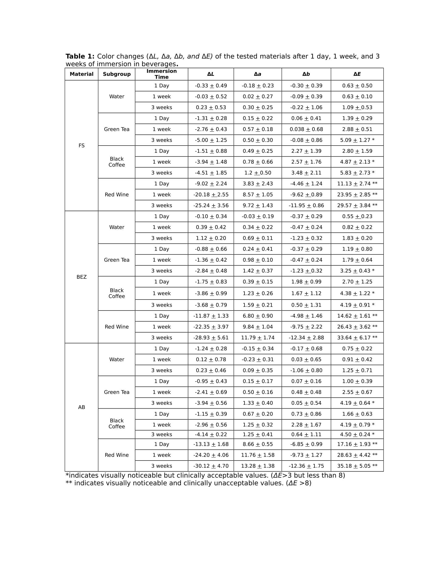 Objectives: To evaluate the effect of four beverages on the color parameters of three composite resins. Methods: Filtek™ Supreme Ultra Universal Restorative-3M (FS), Bulk EZ-Danville (BEZ), and ACTIVA™ BioACTIVE-RESTORATIVE™-Pulpdent (AB) of A2 shades were evaluated. Sixty disc-shaped specimens of 8mm in diameter and 2mm in thickness were prepared (n=20 each). Color coordinates (ΔL*, Δa*, Δb*, and ΔE*) were recorded using Olympus Chrystal Eye unit after 24 hour of storage in distilled water (baseline) and after 1 day, 1 week, and 3 weeks of storage in green tea, black coffee, red wine, or water (control) (n=5). Color changes (ΔE*) were analyzed using two-way ANOVA analysis, with p<0.05 as significance level. Results were adjusted for multiple comparisons using Tukey’s HSD. Data was transformed to achieve homoscedasticity. Means presented in Table 1 are non-transformed. Results: ΔE* ranged between 0.4 and 44.06 after 1 day, 1 week, and 3 weeks of staining. ΔE* for composites in all the beverages except water continuously increased from day 1 to 3 weeks. Red wine caused the most staining followed by black coffee, green tea, and water except after 3 weeks when there was no statistical difference between the staining effect of coffee and green tea. Until 1 week, staining effect was independent of the composite material, however, by 3 weeks FS had stained significantly more than BEZ in green tea (p=0.0089). Conclusions: All the materials used in this study displayed clinically unacceptable color changes in red wine at all times. Staining due to black coffee and green tea was visually unnoticeable after day 1 but became noticeable after 1 week while still being clinically acceptable (ΔE*>3 but <8). BEZ was more color stable than FS after 3 weeks in green tea.