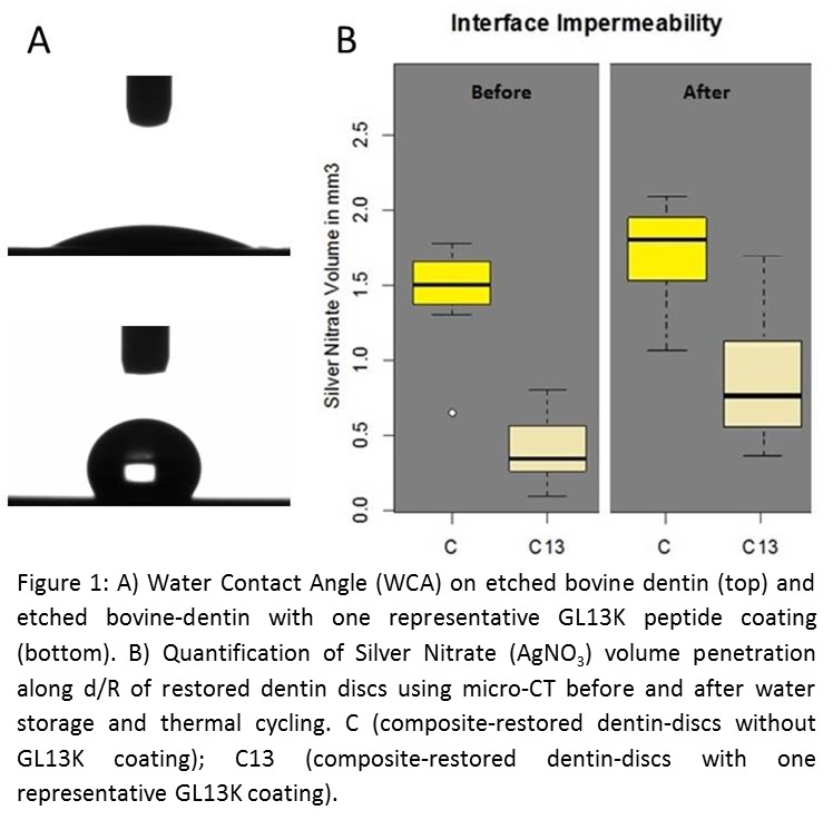 Objectives: Objective: Water-borne (hydrolytic, acidic, enzymatic) and biofilm-mediated degradation of composite restorations (CRs) results in secondary caries and failure. Primer/adhesive resins that penetrate the hydrated collagen at the dentin/CRs interface (d/R) are hydrophilic. Water affinity of resins compromises CRs’ long-term survival. We present a new technology that uses amphipathic antimicrobial peptides to produce hydrophobic dentin that hinders water penetration/interaction at the d/R and will enable development of fully hydrophobic CRs. Methods: Methods: Etched bovine-dentin slabs were coated with amphipathic antimicrobial peptides, GL13K. Several coating conditions were investigated. GL13K-less buffer-soaked slabs acted as controls. Treated dentin was characterized by water contact-angle (WCA), acidic dye (CuSO4) penetration, before and after immersion in human saliva (37°C, 3d), and ultrasonication (15mins). Restored (Z250, Scotch Bond Universal, 3M) GL13K-coated and control dentin discs were hydrolytically challenged (2 months) and thermo-cycled (2500 cycles); then immersed in AgNO3. AgNO3 at the d/R was assessed by micro-computed tomography. Diametral compression on restored dentin discs was performed to assess their bond strength. ANOVA+post-hoc tests determined statistically significant differences. Results: Results: WCA significantly increased from 20ο (etched dentin) to 120ο (GL13K-coated dentin) (n=7, p<0.0001) (Fig.1A). Dentin remained hydrophobic (WCA>100ο) after mechanical and biological challenges. CuSO4 penetration was hindered in GL13K-coated dentin, even after saliva challenge. AgNO3 penetration was significantly reduced at the hydrophobic d/R before (n=7, p<0.0001) and after aging (p<0.005), compared to traditional CRs (Fig.1B). Hydrophobic dentin did not reduce bond strength of restored discs (n=22, p=0.87). Conclusions: Conclusion: Hydrophobic dentin was obtained with amphipathic antimicrobial peptide coatings. GL13K-coated dentin remained hydrophobic after clinically relevant challenges, hindered water penetration/degradation at the d/R, and produced mechanically sound CRs. This new priming technology is expected to increase CRs durability by resisting water-borne degradation at the d/R. It also enables the development of new highly hydrophobic adhesives for long-lasting restorations.