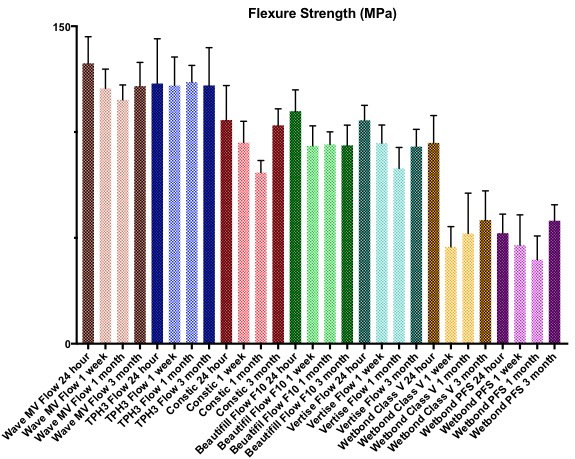 Objectives: To evaluate the flexure strength of self-adhesive flowable composites stored in phosphate buffered solution (PBS) Methods: 5 self-adhesive flowable composites, 1 giomer and 1 flowable composite were selected for evaluation. Bar specimens were created for each material using a standard 2mm x 2mm x 15mm mold in combination with a high powered LED curing light step cured along the legth of sepcimen. 48 bar specimens were made of each material and randomly divided into 4 storage time groups (n=12); 24 hours, 1 week, 1 month and 3 month storage times. The specimens were placed into PBS solution immediately following fabrication and stored at physiological conditions (37C/98% RH) until the prescribed testing time. 3-point bending was accomplished on each specimen using a universal testing machine (MTS; 0.5mm/min) and a standard 3-point bending apparatus. Fracture load (N) was converted to peak stress (MPa). Data analyzed using Kruskal-Wallis with Dunn’s post hoc test (p=0.05). Results: (illustrated in graph) Conclusions: Discussion: As with other self-adhesives and all in one products, there are concerns regarding inherit increased hydrophilicity and the effects this might have upon material properties in long term service in an aqueous environment. The results of this study illustrates significant differences in flexure strength among the self-adhesive flowable composites selected in this study; before and after PBS storage. Other available studies on self-adhesive flowables, suggest concerns for inferior physical properties and bonding of self-adhesive flowables in comparison to traditional adhesively bonded flowables. Conclusions: There are significant differences among the self-adhesive flowables evaluated in this study. Based on these findings and other literature available on this subject, clinicians should be cautious in their selection and implementation of these materials. Additional studies would aid clinicians in determining if particular self-adhesive flowables have a place in their dental practice.