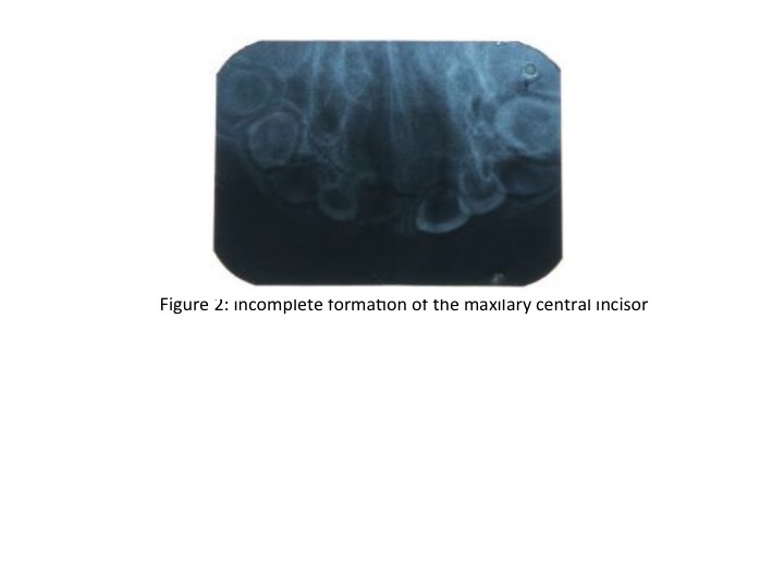 Objectives: The aim of this short report was to describe the preliminary dental findings of 16 Infants between 4 to 7 months of age, patients at the University Hospital Oswaldo Cruz (HUOC), University of Pernambuco, Recife, Brazil, with confirmed diagnosis of microcephaly by ZIKV. Methods: The Oswaldo Cruz University Hospital is one of the centers of reference for diagnosis and treatment of children with microcephaly. Babies diagnosed with Zika congenital syndrome by tomography and Cerebrospinal Fluid (CSF) positive to ZIKV, by excluding other diseases such as cytomegalovirus, toxoplasmosis, rubella, syphilis, dengue fever, chikungunya and HIV were recruited for dental exam. The dental clinical exam looked for mucosal lesions, congenital abnormalities, infectious diseases, tumors, absence of teeth, prenatal or neonatal teeth and other disorders. For the radiographic examination the baby’s head was held by mother and two dental assistants in centric occlusal view, using periapical size film. This project was approved by the Internal Review Board of the University of Pernambuco by the number of 52675616.0.0000.1526 Results: The radiographic examination showed no anodontia affecting the maxillary anterior region of any of the infants, however, two Infants presented with supernumerary teeth and absence of teeth in both arches, one with bell shaped teeth and one with incomplete formation of the maxillary central incisor (Fig.1 and Fig.2). Conclusions: In summary, while numerous questions remain to be answered, this work was able to indicate that the dental disorder caused by Zika Virus may have occurred after the 12th week of intrauterine life. More studies are needed to clarify questions concerning this syndrome.