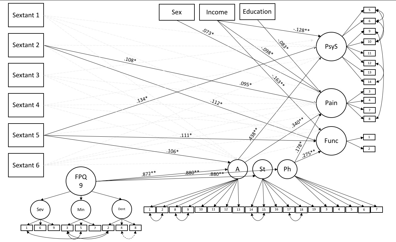 Objectives: The impact of oral health-related quality of life (OHRQoL) has been studied extensively and remains an important factor in dental research. Researchers, however, have conducted only a few studies to examine the mediating effect of psychosocial phenomena between disease and OHRQoL. More specifically, there is a dearth of research examining the impact of psychosocial factors on the relationship between periodontal diseases and OHRQoL. Methods: The present study focused on data from Appalachian adult participants (n = 895) from the Center for Oral Health Research in Appalachia (COHRA1) family-based cohort. Data were derived from a modified Periodontal Screening and Recording Index (PSR) focusing on sextants, responses to the Dental Fear Survey, Fear of Pain Questionnaire-9, and the Oral Health Impact Profile-14. Confirmatory factor analyses and structural equation modeling were used to estimate the effects of clinical periodontal disease screening indicators on oral health-related quality of life. Additionally, the role of dental fear in mediating the relationship between the PSR results and OHRQoL was assessed, while accounting for the variance due to fear of pain and demographic variables. Results: A significant total effect was found between PSR sextant five (mandibular anterior), avoidance and anticipatory fear, and indicators of OHRQoL (Psychological β = .185, p < .001; Pain β = .128, p = .010; Functionality β = .145, p = .007). Anticipatory fear and physiological arousal subscale scores of the Dental Fear Survey help to predict factors of the OHIP-14. Other significant associations between sextants, dental fear, and OHIP scores were found. Conclusions: Findings confirm the relation of periodontal disease indicators and OHRQoL. Dental avoidance and anticipatory fear mediates oral health-related quality of life in patients with indicators of periodontal disease in a sextant that may be visible and noticeable in terms of periodontal involvement.