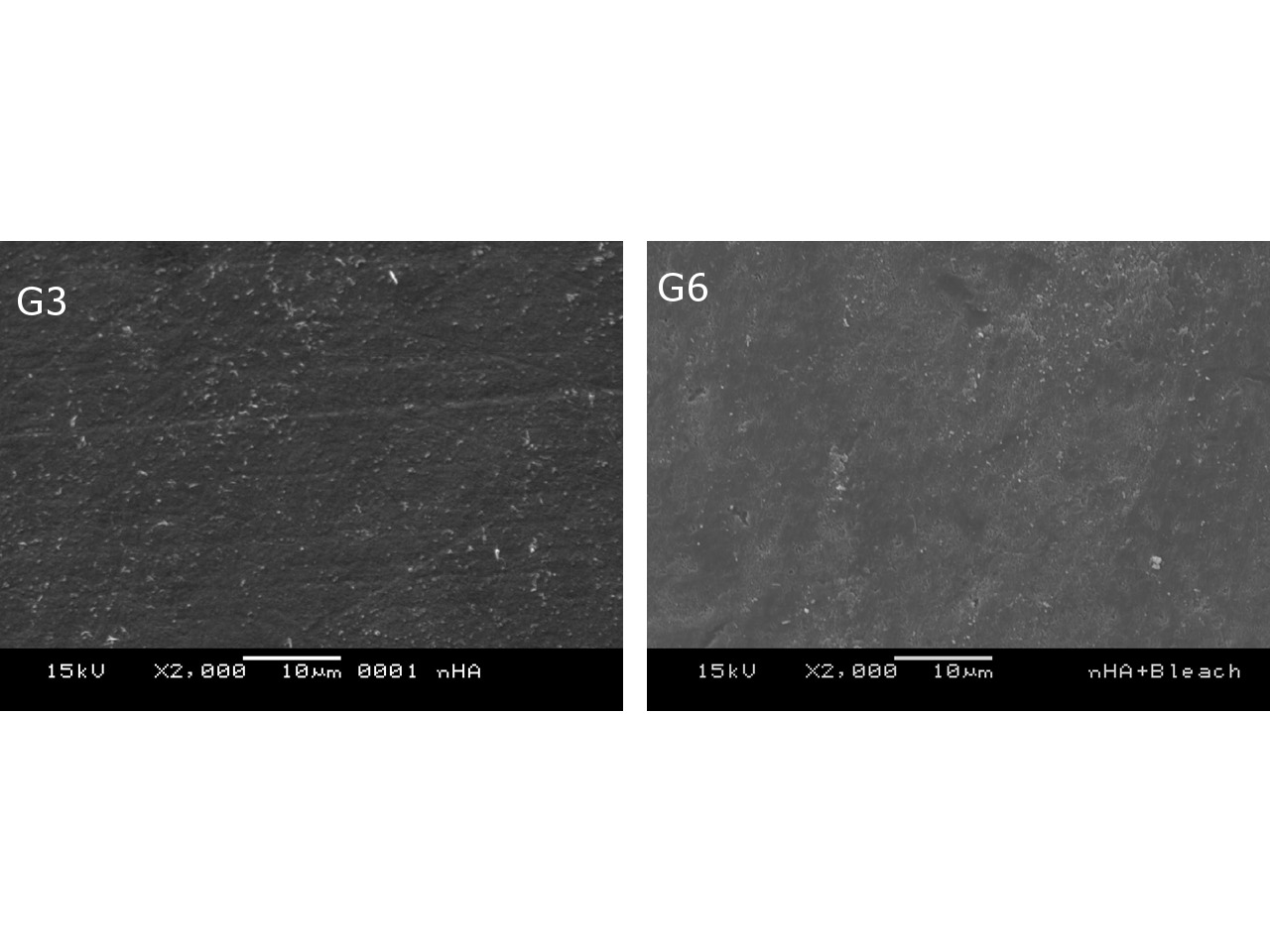 Objectives: Evaluated the effect of different desensitizing agents application on bleached and unbleached enamel using surface (KHN) and subsurface microhardness (subKHN), roughness (Ra) and color variation (Cie Lab). Methods: One hundred and sixty tooth blocks were divided into six groups (n=10), according to bleaching treatment (BT) and application of desensitizing agent (DA). G1: without BT and DA; G2: application of DA of potassium nitrate (PN); G3: application of DA of nano-hydroxyapatite (nHA); G4: only BT; G5: application of PN prior BT; G6: application of nHA prior BT. As for BT, three whitening sessions were conducted using 35% hydrogen peroxide. Color, KHN, Ra measurements were taken before (t0) and after (t1) treatment protocols. SubKHN specimens were evaluated to a depth of 125μm, with an interval of 25μm. Two extra samples from each group were analyzed using a scanning electron microscope. KHN and Ra results were analyzed by PROC-MIXED and Tukey–Kramer test. Color changes ΔL, ΔE were evaluated using one-way ANOVA followed by Tukey tests, whereas Δa, Δb used the Kruskal–Wallis test and Dunn’s test. SubKHN was analyzed by ANOVA multi-factor split-plot method and Tukey test (α=0.05). Results: In ΔE color analysis, the bleached groups did not present difference among them. There was statistical difference between t0-t1 in KHN reduction in G2 and G5. All groups, except for G1, showed an increase in Ra in t1. In subKHN, G2 showed lower microhardness in 25μm depth compared to G1 and G3. G6 showed higher microhardness in all depths differing from G4. Conclusions: Desensitizing agents application did not influence bleaching efficacy. Potassium nitrate application in bleached and unbleached enamel reduced KHN, however it did not reduce subKHN in the bleached group. Nano-hydroxyapatite did not affect KHN and prevented subKHN reduction after bleaching. DA increased unbleached enamel roughness and did not increase bleached enamel roughness.