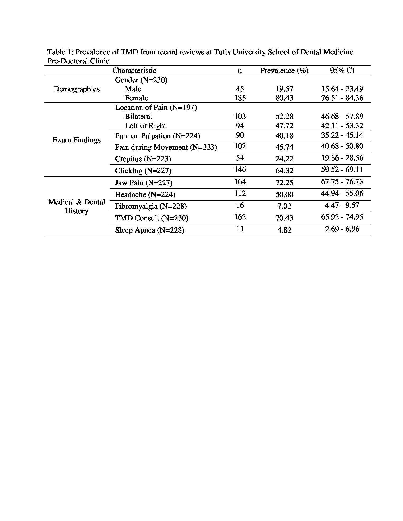 Objectives: Currently, there are no studies looking at the prevalence of Temporomandibular Jaw Disorders (TMD) among patients who visit Dental School Clinics for routine dental treatment. The objective of this study is to evaluate the prevalence of TMD signs and symptoms among patients in the pre-doctoral clinics at Tufts University School of Dental Medicine (TUSDM) and determine if there is an association between findings from Demographics, Exams, Medical History and development of TMD. Methods: Following IRB approval, medical records from patients who reported presence of Temporomandibular Jaw (TMJ) pain and/or clicking/crepitus in the past 5 years (2010-2015) were reviewed. A specifically designed questionnaire incorporated into a comprehensive exam at pre-doctoral clinics at TUSDM was used to select a random sample of 230 patients who reported presence of TMJ pain. (N=230) A discrepancy in the sample size was identified among variables due to incomplete responses in the questionnaires found in some patient charts. The following variables were analyzed; Age, Gender, Location of Pain, Pain on Palpation, Pain during Movement, Crepitus, Clicking, Jaw pain, Headache, Fibromyalgia, TMD Consult and Sleep Apnea. In Table 1, the prevalence and 95% confidence intervals for each were calculated based on the number of corresponding response (n). Results: The total number of patients who visited the dental clinic during the 5 years was 44,580. A total of 1,100(2.5%) patients reported presence of clicking or crepitus. 555(1.26%) reported presence of TMJ pain and the mean age was 45.6 years old. Conclusions: This analysis of the record reviews of 230 patients demonstrates the overall prevalence of TMD among patients visiting pre-doctoral clinics. Results from this study indicate that there is a need for educating pre-doctoral students to identify TMD and seek appropriate referral. Further studies with a larger sample size among other dental school clinics are recommended to confirm our findings.