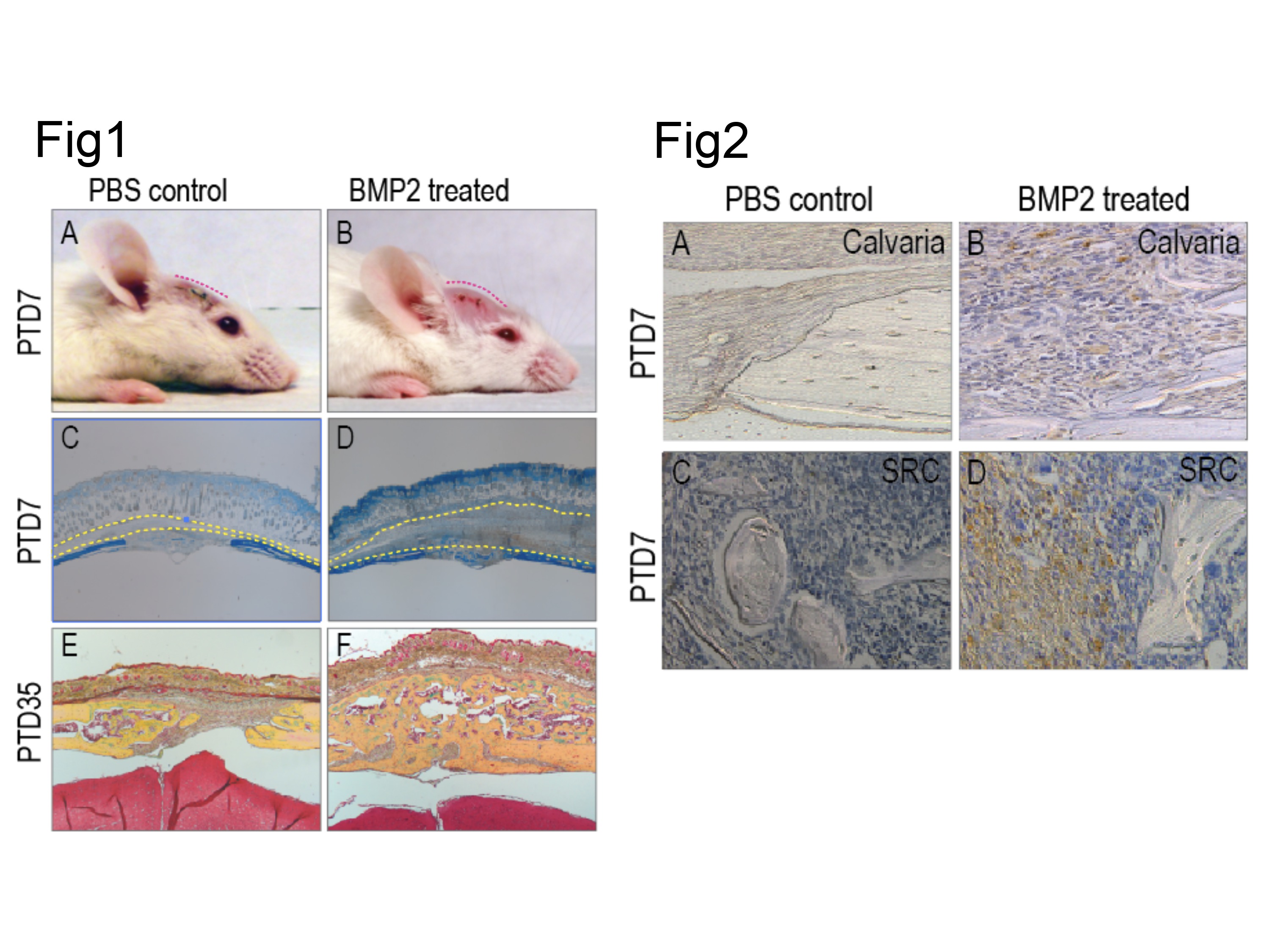 Objectives: Bone-morphogenetic protein-2 (BMP2) is a bone-grafting substitute for craniofacial bone reconstruction, whose use is encumbered by clinical complications including life-threatening postoperative inflammation and ectopic bone formation. Macrophages are key mediators of inflammation and are implicated in both orthotopic and heterotopic bone formation. We hypothesize that BMP2 triggers a macrophage-driven inflammation that causes ectopic bone formation. If this hypothesis is true then modulation of macrophage-driven inflammation would be a potential therapeutic approach to prevent heterotopic ossification. Here, we sought to define the contribution of macrophage-driven inflammation to ectopic bone formation by BMP2. Methods: Bone graft material harvested from the long bones of transgenic (Axin2LacZ/+,ACTb-EGFP) adult mice was treated with PBS or BMP2 (50ng/µL) then transferred to either a calvarial bone defect or to the sub-renal capsule (SRC), of syngeneic host mice. Grafted tissues were assessed clinically, by histology, and by immunohistochemistry at days 3, 7, 14 and 35 after grafting. Results: BMP2-treated grafts were associated with significant soft tissue swelling (Fig1A-D). These clinical findings were substantiated by histological evaluation. At day 35, BMP2-treated bone grafts had generated significant amounts of bone that overfilled the defect and reached the subcutaneous space (Fig1E-F). This BMP2-induced ectopic bone was associated with increased number of F4-80+ cells at day 7 after grafting (Fig2A-B). Similar findings were confirmed in SRC model at day 7 (Fig2C-D). Conclusions: F4-80+ cell infiltration was triggered by BMP2 in both orthotopic and heterotopic bone sites, suggesting that BMP2 elicits a macrophage-driven inflammatory response causing bone formation. Targeting macrophage-driven inflammation constitutes a potential pathway to further understand and then prevent BMP2 associated ectopic bone formation.
