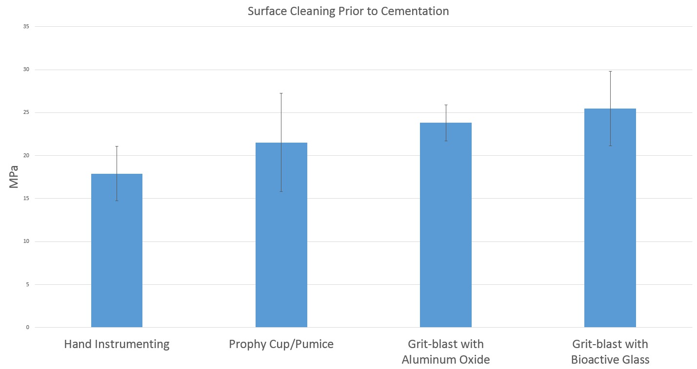 Objectives: Clinicians are often challenged to remove “temporary” cement prior to cementing a final restoration. This project measured the shear bond strength of a self-etching resin cement to dentin after the tooth surface was “cleaned” of temporary cement by four methods. Methods: 40 non-carious extracted human molars were randomly assigned to four groups. The teeth were de-coronated to provide a flat dentin surface. Teeth were embedded in acrylic and wet-polished through 600-grit with abrasive papers. Teeth had Temp-Bond NE cement (Kerr, Orange, CA) applied to the surface and cured. Samples were allowed to rest for 24 hours (37C & 100% humidity) and had the cement removed by one of four methods: 1) hand-instrumenting; 2) pumice/prophy cup (Preppies, WhipMix, Louisville, Kentucky) using a low-speed handpiece (2,000rpm); 3) air abrasion with aluminum oxide particles (Danville Materials, San Ramon, CA) (27um); and 4) air abrasion with bioactive glass (BAG) particles. Both air abrasions were performed with a Danville microetcher at 60 psi. BAG particles (65 mol%SiO2, 31mol%CaO, 4mol% P2O5) were synthesized in our laboratory, ground and micronized to obtain particles < 17 um. After cleaning, samples were rinsed with water and air dried. Samples were placed into an Ultradent jig (Ultradent, South Jordan, UT) and RelyX™ Unicem 2 Self-Adhesive Resin Cement (3M ESPE, Minneapolis, MN) was added to the dentin surface to produce 2mm-high posts. Samples were self-cured for 2 minutes and light cured for 20 seconds. Posts underwent shear bond-strength testing with an Electropuls E-3000 (Instron, Norwood, MA) using a crosshead speed of 0.5mm/min. Data were compared using ANOVA (with post-hoc Tukey) with α=0.05. Results: Hand cleaning produced significantly lower bond strength compared to air abrasion with either material. All other comparisons were statistically equivalent. Conclusions: For highest bond strength and durability when cementing indirect ceramic restorations, grit blast removal of temporary cement is recommended.