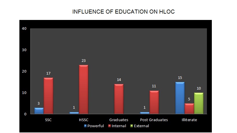 Objectives: To assess the changes in a person's Health Locus of Control (HLoC) with the increasing level of education and the impact of gender on it. Methods: A randomised sample of 100 individuals was chosen between the ages of 35-44 in Lahore. Collection of data was done using a self-administered questionnaire comprising of 12 questions covering all 3 aspects of HLoC i.e Internal, External and Powerful Others and the education level of individuals. It was mandatory for all participants to fill out the questionnaire after an informed consent. Data entry and statistical analysis was done using IBM SPSS version 20. The final sample size consisted of 63% males and 37% females. 30% of the samples were illiterate, 20% had a Secondary School Certificate (SSC), 24% had a Higher Secondary School Certificate (HSSC), 14% were Graduates and 12% had a Post Graduate Degree. Frequency distribution and Chi-Square tests of significance were performed. Results: 70% of the sample exhibited Internal HLoC followed by Powerful Others (20%) and External HLoC (10%). Significant relationships were observed between one's HLoC and the level of education. Results showed that with the increasing level of education, people were more inclined towards the Internal HLoC as compared to illiterates who relied on external factors such as fate and the help of Powerful Others such as medical practitioners for the well-being of their health. The males showed a higher frequency of Internal HLoC (50%) as compared to females (20%). Conclusions: Findings of this study suggest that regardless of gender, education has a major impact on a person's HLoC. Lower internal HLoC among the illiterate population of Lahore call for professional intervention through educational programs.