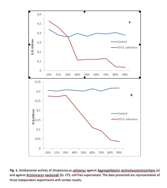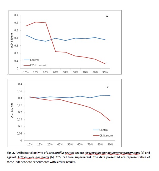 Objectives: New strategies to prevent oral diseases are based on manipulating oral microbiota, which is provided by probiotics. The aim of this study was to evaluate the effects of two commercially available probiotics Streptococcus salivarius M18 and Lactobacillus reuteri Prodentis on growth inhibition of chromogenic bacteria, specifically A. actinomycetemcomitans and A. naeslundii. Methods: this in vitro study was carried out using their cell-free fermentative broth in a planktonic growth inhibition test. Streptococcus salivarius M18 and Lactobacillus reuteri for each of the strains were used as probiotic strains. Two types of oral bacteria were used to test the antibacterial effect of these probiotic strains Aggregatibacter actinomycetemcomitans and Actinomyces naeslundii They were cultured using Schaedler agar with vitamin K and 5% Sheep Blood in anaerobic conditions. Results: Anti-A. actinomycetemcomitans activity of S. salivarius M18 occurred at a concentration of 40% (Figure 1a), with a complete growth inhibition at 90% (Figure 1a), while anti –A. naeslundii activity of S. salivarius occurred at a concentration of 60% with a complete growth inhibition at 90% (Figure 1b), demonstrating that A. actinomycetemcomitans is more susceptible to the antimicrobial activity of S. salivarius than A. naeslundii. Anti-A. actinomycetemcomitans activity of L. reuteri occurred at a concentration of 60% (Figure 2a), with a complete growth inhibition at 90% (Figure 2a), while anti –A. naeslundii activity of L. reuteri occurred at a concentration of 90% without reaching a complete growth inhibition at this concentration (Figure 2b), demonstrating that A. actinomycetemcomitans is more susceptible to the antimicrobial activity of L. reuteri than A. naeslundii. Conclusions: These data show that Actinomyces naeslundi is less susceptible to the probiotic activity of both S. salivarius and L. reuteri. However, Streptococcus salivarius showed a stronger antimicrobial activity than Lactobacillus reuteri against the two indicator strains used.