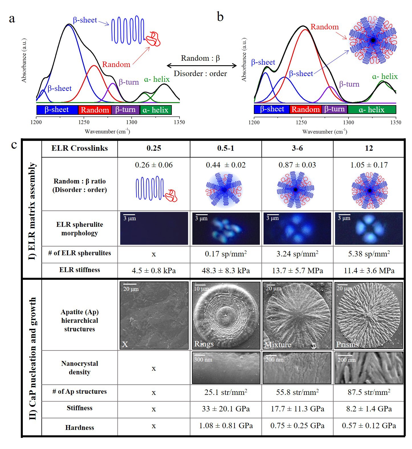 Objectives: There is growing evidence that intrinsically disordered proteins (IDPs) play a fundamental role in mineralisation. IDPs contribute in intermolecular interactions at the protein–mineral interface. Here we report a protein-mediated mineralisation process that takes advantage of disorder-order interplay using elastin-like recombinamers (ELRs) to program organic-inorganic interactions into hierarchically-ordered mineralised structures. Methods: We exploited recombinant technologies to design a supramolecular matrix that is based on ELR molecules consisting of a main hydrophobic framework (VPGIG), a positively charged segment (VPGKG) with the amino acid lysine (K) for ELR cross-linking, and the highly-acidic statherin-derived analogue. In addition, collagen membranes, ELR-coated glass, and membranes made from similar ELR molecules without the statherin-derived peptide or with the cell adhesive RGDS were used as controls. Through FTIR deconvolution of the amide III spectral region, a quantitative analysis of the protein secondary structure can be established. Results: During crosslinking/drying process, ELRs self-assemble into a dense network of b-amyloid-like fibrils and homogenously distributed three-dimensional (3D) ELR spherulites. Therefore, these organic supramolecular structures formed independently of the type of ELR used. We discovered that by systematically modifying the amount of cross-linker, it was possible to modulate the levels of ELR ordered b-sheet and disordered random coil conformation, while maintaining β-turn and α-helix nearly constant. Upon incubation in a solution supersaturated with respect to apatite, the materials comprise elongated apatite nanocrystals that are aligned and organised into microscopic prisms, which grow together into spherulite-like structures hundreds of microns in diameter. Conclusions: The synthetic hierarchical structures can be grown over large uneven surfaces and native tissues as acid resistant membranes or coatings with tuneable hierarchy, and properties. Our study represents a potential strategy for complex materials design that may open opportunities for hard tissue repair and provide insights into the role of molecular disorder in human physiology and pathology.