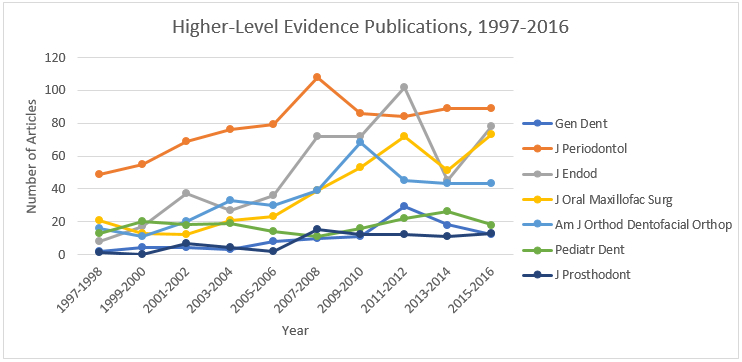 Objectives: The purpose of this study was to perform a descriptive analysis of the trends in the number of higher-level evidence (HLE) publications in the professionally owned journals for general dentistry and six dental specialties from 1997-2016. Methods: The journals included were: General Dentistry (Gen Dent), Journal of Periodontology (J Periodontol), Journal of Endodontics (J Endod), Journal of Oral and Maxillofacial Surgery (J Oral Maxillofac Surg), American Journal of Orthodontics and Dentofacial Orthopedics (Am J Orthod Dentofacial Orthop), Pediatric Dentistry Journal (Pediatr Dent), and Journal of Prosthodontics (J Prosthodont). Each journal’s publications were analyzed from January 1, 1997 to December 31, 2016 using NLM’s PubMed database filters to identify the number of HLE publications. Each journal was filtered by article type to show only meta analyses, randomized control trials, and systematic reviews. “Results by year” were then downloaded in an Excel file to calculate the number of publications for each two-year increment. The average number and percent change of HLE publications were also calculated for each journal for the 1997-2016 time period. Results: The journals with the highest and lowest average number of HLE publications, per 2-year intervals, were the Journal of Periodontology (78) and the Journal of Prosthodontics (8), respectively. The journals with the highest and lowest percent increase in HLE publications were the Journal of Endodontics (70%) and the PediatricDentistry Journal (5%), respectively. Conclusions: Overall, there was a positive trend in the percentage of HLE publications from 1997 to 2016. The data was limited to the year 2016 because of incomplete indexing by the National Library of Medicine starting in 2017. Growth in HLE publications is expected to continue in future years due to an increased understanding of the importance of evidence-based practice in dentistry.