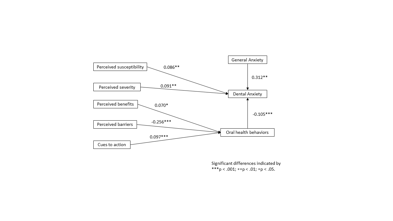 Objectives: The aim of the present study was to evaluate the efficiency of the Health Belief Model (HBM) in predicting dental anxiety among adolescents. Methods: The study had a cross-sectional design and included 1207 S2 students of 12 secondary schools which were randomly selected from Hong Kong. Data were collected through clinical dental examinations (DMFT) and the questionnaire regarding constructs of health belief model, individual socioeconomic status, oral health behaviors and dental anxiety. Hierarchical regression analyses and structure equation modeling were applied to analyze data. Structural equation modeling was used to test the hypothesized model: pathways to predict dental anxiety based on HBM both directly and via oral health behaviors. Results: The final model of hierarchical regression analyses showed that girls had higher dental anxiety levels than boys (β=0.096, p<0.01); adolescents who flossed weekly had lower dental anxiety (β=-0.064, p<0.05); and general anxiety (β=0.261, p<0.001), perceived susceptibility (β=0.077, p<0.05) and perceived severity (β=0.094, p<0.01) were all positively associated with dental anxiety levels. The revised final model of path analysis showed a good fit to the model (TLI=0.977; CFI=0.996; RMSEA=0.021; χ2=10.735; df=7; p=0.151). Perceived susceptibility and perceived severity both had a direct effect on dental anxiety. Conclusions: Our reports support that HBM can predict dental anxiety among adolescents both directly and via oral health-related behaviors.