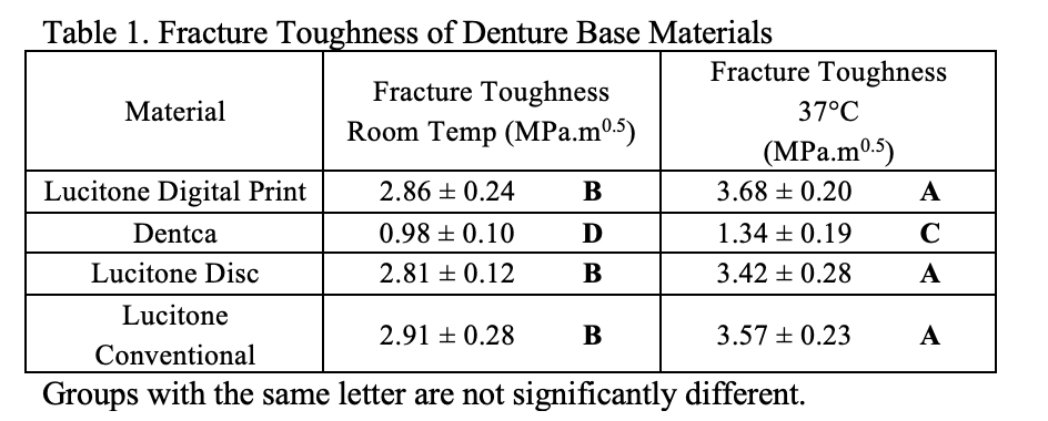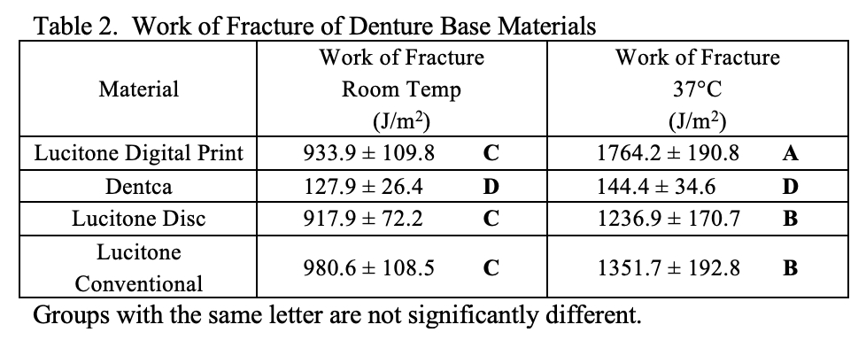 Objectives: To determine the fracture toughness and work of fracture of different types of denture base materials. Methods: Specimens for fracture toughness and work of fracture of various denture base materials were prepared according to ISO 20795-1:2013 using single edge-notch bars pre-cracked according to the specification; 39.0 X 8.0 X 4.0 mm. Materials tested were: 1) Lucitone Digital Print (Dentsply-Sirona, United States), 2) Lucitoneâ 199 Denture base disc (Dentsply-Sirona, United States), 3) Lucitoneâ 199 (Dentsply Sirona, United States), and 4) DENTCA (Torrance, CA). All specimens were prepared following manufacturer’s instruction. Group 1 and 4 were printed using a Carbon 3D printer. Group 2 was sectioned from the disc and 3 by conventional processing . All specimens from each group were stored in water at 37±1°C for 7 days ± 2 hours before. Half of the specimens for each group were then conditioned in a separate water bath at 23±1°C for 60 ± 15 minutes before testing. The other half were tested in a chamber at 37±1°C . Fracture toughness was tested with Universal testing machine (Instron, United States). Means of fracture toughness and work of fracture values were analyzed using analysis of variance (ANOVA) and Tukey post hoc test (p<0.05). Results: The average and standard deviation of fracture toughness and work of fracture of different denture base materials are shown in Table 1 and Table 2. Conclusions: Fracture toughness and work of fracture of various denture base materials are significantly different. Elevated temperatures resulted in higher values for all tested materials except Dentca work of fracture.