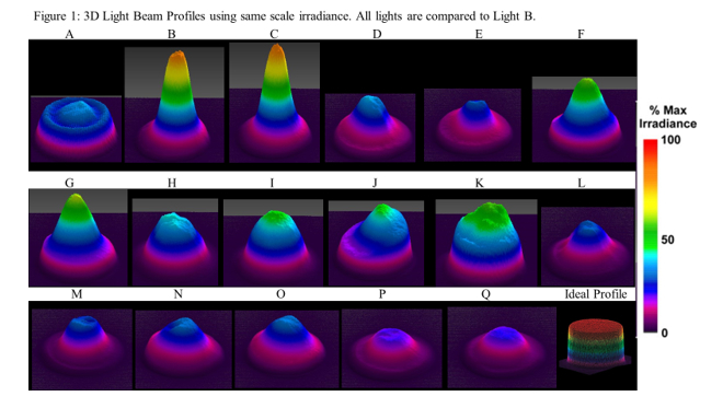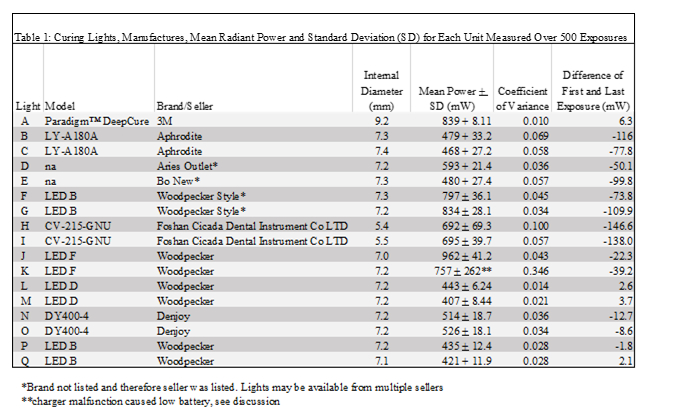 Objectives: Measure the power, irradiance, emission spectrum, and beam profiles from eight budget light-curing units(LCU) and one from 3M for 500 exposures each lasting 20s. Methods: Radiant power was measured using a spectroradiometer attached to an integrating sphere(OceanOptics), see Table1. Every 10-20 exposures, (through 500 20s exposures,) measurements were recorded with 60+s rest between exposures. After 100 exposures, the LCUs were recharged. Irradiance distributions of the light beams were measured across the emitting surface of the lightguide using a laser beam profiler(Ophir®Spiricon). Total radiant power output values were entered into Beamgage software, producing two and three-dimensional color-coded profile images of the irradiance distribution across the beam, Figure1. Mean radiant power, standard deviation and coefficient of variation were calculated to compare outputs. Results: Several of the lights did not have serial numbers or shared the same number. Lights K and J were the same model. However, K was polywave and J was a single-peak blue LED. Emission spectra for all LCUs was within the manufacturers' range. The radiant power from lights B-G decreased as the number of exposures increased (greatest loss Lights H -146.6mW and I -138.0mW) while Lights A, L-Q were nearly unchanged. Lights K, H, and B showed the greatest variation in power output over 500 exposures(Coef. Var 0.346, 0.100, and 0.0694, respectively). The beam profiles from lights A and K were closest to an ideal shape. Lights B, C, F and G delivered narrow Gaussian shaped irradiance peaks of light. Light J although broad, was skewed. Conclusions: None of the budget lights performed well in all categories. For most budget LCUs, the power output decreased with use. Lights A and Q delivered the most consistent power outputs (Coef. Var 0.010 and 0.014, respectively). A and K displayed a relatively flat beam profile, where the irradiance was evenly distributed across the light tip.