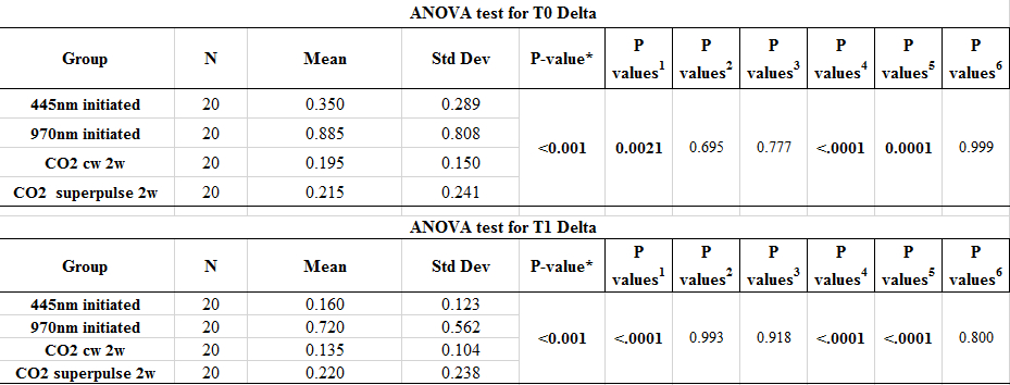 Objectives: The aim of our study was to evaluate temperature increase during incisions using diode and CO2 lasers. Methods: Chicken breast at room temperature was used. Two thermocouples (T0 and T1) were placed into chicken breast at distance of 20mm. Parallel incisions (in total 80) were made 3mm away from the thermocouples using diode lasers (445nm/blue light and 970nm) with initiated tips (2W continuous wave, CW) and CO2 laser with 2W (CW and Superpulse mode). Temperature changes were recorded in real time. Statistical comparison was performed using ANOVA and Tukey tests. Results: Temperature increases during laser irradiation area demonstrated in the table. *Tested by one-way repeated analysis of variance (ANOVA) 1 Tested by Tukey tests of differences between means of 445nm initiated vs. 970nm initiated; 2 Tested by Tukey tests of differences between means of 445nm initiated vs. CO2 laser cw 2w; 3 Tested by Tukey tests of differences between means of 445nm initiated vs. CO2 laser superpulse 2w. 4 Tested by Tukey tests of differences between means of 970nm initiated vs.CO2 laser cw 2w. 5 Tested by Tukey tests of differences between means of 970nm initiated vs. CO2 laser superpulse 2w. 6 Tested by Tukey tests of differences between means of CO2 laser cw 2w vs. CO2 laser superpulse 2w. Conclusions: Within the limitations of this study the 445nm (blue light) diode laser has a similar impact on temperature changes, like the conventional CO2 in cw or Superpulse mode for surgery and has a lower risk than the 970nm diode laser.