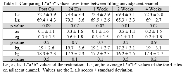 Objectives: To evaluate if there is evidence of shade matching over a months’ time, with composite restorations before and after bleaching. Methods: Ten extracted teeth with varying shades A1-D4 were collected. Samples were restored with Tetric EvoCeram® Bulk Fill (Ivoclar Vivadent) a Universal A shade composite. ClassV preparations (approximately 6mm x 2mm x 1.5mm) were acid etched with 40% Phosphoric Acid for 30 seconds, rinsed and air dried. Teeth were bonded with a fifth-generation bonding agent, filled and finished/polished with Super Snap and OneGloss(Shofu). The teeth were stored in distilled water at 37○C for 24hrs. Shades were evaluated by 2 calibrated clinicians using the VITA Classic shade guide and given an overall matching score between the restoration and tooth, using a scale of: Matches, Somewhat Matches, and Does not Match. All shade evaluations were recorded at a total of 5 locations, 4 sites around the restoration, and the 5th site directly over the restoration. Samples were completely immersed with Opalescence Boost(Ultradent) for 20 minutes, according to manufacturer’s instructions, two consecutive times, rinsed and placed in distilled water for 24 hours. L*a*b* and VITA shades were recorded post-operation(no bleaching), at 24 hours, 1 week, 2 weeks, 4 weeks post bleaching using the CrystalEye Spectrophotometer(Olympus). Each sample was evaluated under the Olympus stereomicroscope(SZX16). L*a*b* values of the 4 sites around the restoration were averaged and compared to the L*a*b* values of the restoration. Stata 15 was used and significant level was set at 0.01. Results: Average color change after bleaching was 3 shades. Shade matching scores by the clinicians showed the composite matched 100%, for all teeth at all time intervals. There was no significant difference in the L*a*b* values between the restoration and tooth at each time interval(Table 1). Conclusions: The shade of the filling matched that of the adjacent enamel pre- and post-bleaching.