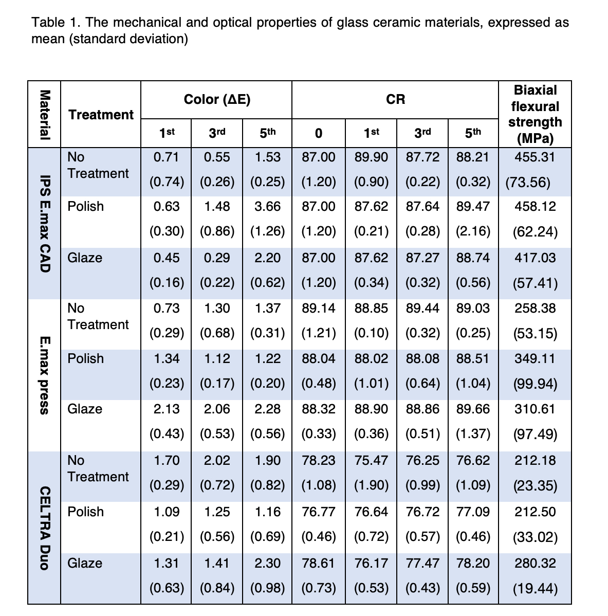Objectives: To investigate the effect of various finishing procedures and repeated firings on color stability and translucency of different glass ceramics. Also, to examine the differences in biaxial flexural strength after various finishing procedures. Methods: Three glass-ceramics were investigated; IPS E.max CAD, E.max press and CELTRA Duo. 51 disk-shape specimens, 2 mm in thickness and 12 mm in diameter, for each material were fabricated. Specimens were divided into 3 groups (n=17) as control/no treatment, polishing and glazing group. Five samples from each group were subjected to 1, 3, and 5 simulated “stain” firings using a ceramic furnace according to the manufacturer’s instructions. Color coordinates were recorded in CIE L*a*b* system using an X-rite Ci7600 spectrophotometer and Vita Easy Shade. Color differences relative to the control (ΔE) and translucency by contrast ratio (CR) were recorded. The 3-point flexural strength test was performed using an Instron universal testing machine at across head speed of 0.5 mm/min. with n=12. Data were analyzed using multiple ANOVA (α=0.05). Results: The average and standard deviation of color changes to the green body, contrast ratio and biaxial flexural strength of different glass ceramic materials is shown in Table 1. Contrast ratio of CELTRA Duo is significantly lower than IPS E.max CAD and E.max Press (p <0.0001). Contrast ratio after repeated firings increases for IPS E.max CAD and E.max press, but decreases for CELTRA Duo. Treatment, Material type, and firing cycle has no significant effect on color change measured with the spectrophotometer (p >0.05). However, repeated firings produce significantly higher color change than one firing cycle as measured with Easyshade (p<0.001). After glazing, E.max press has the highest color change, E.max CAD shows the lowest. E.max CAD has significantly higher flexural strength than E.max press and CELTRA Duo. Polished and glazed materials show higher (not statistically significant) flexural strength than no treatment groups. Conclusions: Type of material, treatment and firing cycle have significant effect on translucency, but their effect on color changes are not clinically perceptible. Polishing and glazing can improve the flexural strength of the glass ceramic materials.