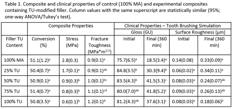 Objectives: Introduction of thiourethane (TU) oligomer to restorative materials reduces stress and improves fracture toughness without compromising conversion (Bacchi et al, 2015). The localization of TU at the resin-filler interface via silanization procedures may lead to more substantial stress reduction and clinical property enhancements. The purpose of this study was to evaluate composite properties as a function of TU-functionalized filler concentration. Methods: TU-functionalized fillers were synthesized using a combination of trimethylol-tris-3-mercaptopropionate, dicyclohexylmethane 4,4'-diisocyanate, and 3-(triethoxysilyl)propyl isocyanate (Faria-e-Silva et al., 2018). These were combined with methacrylate-silanized barium filler (MA) at 0:1, 1:3, 1:1, 3:1 and 1:0 ratios. Composites were formulated using 65wt% TU/MA-filler, 5wt% OX50 fumed silica and 30wt% BisGMA/UDMA/TEGDMA (50/30/20 mass ratio) resin. CQ/EDMAB (0.2/0.8wt%) and BHT (0.2wt%) were used as photoinitiators and inhibitor, respectively. Samples were photocured using LED light at 600 mW/cm2 for 20 seconds (Demi Plus; Kerr). Testing included real-time polymerization kinetics (near-IR), polymerization stress (Bioman) and fracture toughness (SEN-bending; MTS). Gloss (2×2mm, 60°; Novocurve, Rhopoint) and surface roughness (0.8mm cut-off, 2mm trace length; TR200) measurements were taken before and after subjecting the samples to 6 hours of continuous toothbrushing in a custom-built apparatus using a toothpaste/water mixture. Data were analyzed with one-way ANOVA/Tukey’s test (α=0.05). Results: Increasing TU-filler led to up to 80% reduction in stress (0.6 vs. 2.8 MPa for the methacrylate control) and increase in fracture toughness (1.2 vs. 0.9 MPa.m1/2 for the control). Conversion was similar for all groups. After toothbrushing, gloss reduction was lower for TU-containing composites (46 and 64%), compared to 76% reduction for the control, and surface roughness was less than or equal to the control. Conclusions: Modification of inorganic filler with TU-oligomers can be an effective approach for stress reduction and mechanical property enhancement of dental composites. In addition, TU-modified filler composites showed enhanced surface polish retention under simulated toothbrushing conditions.