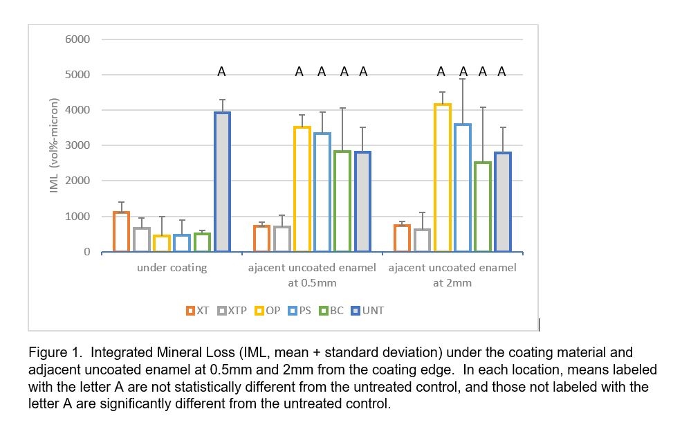 Table 2. Integrated mineral loss (IML, mean (standard deviation)) under the coating material and adjacent uncoated enamel at 0.5mm and 2mm from the coating edge.