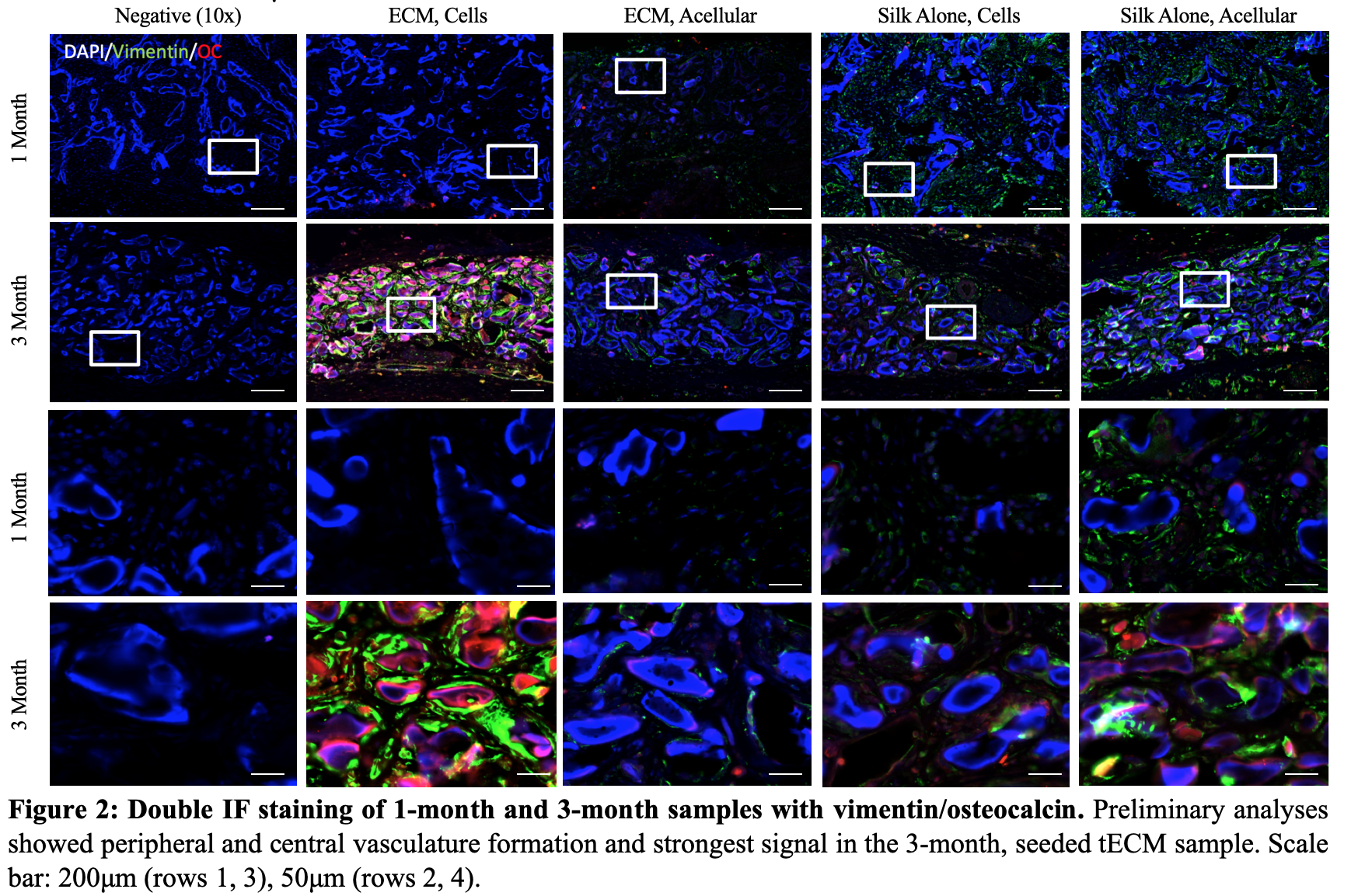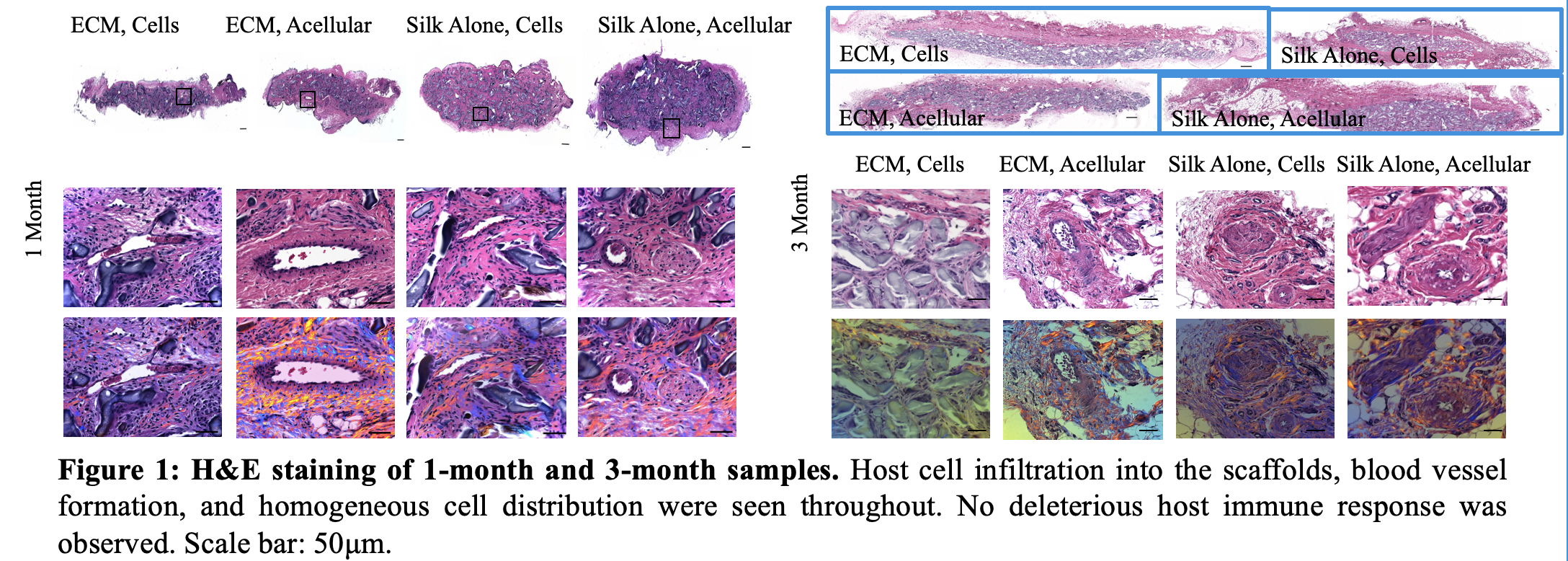 Objectives: Approximately 160 million adults suffer from tooth loss in the United States. While root canal therapy and prostheses are common treatments, neither reproduces the biological qualities of a living tooth. It is critical to seek alternative treatments and investigate methods to regenerate dental pulp, which sustains teeth by providing nutrients, oxygen, innervation, and immune response. We sought to determine if decellularized, pig tooth bud-derived extracellular matrix (tECM) promotes the differentiation of porcine dental pulp-derived dental mesenchymal stem cells (DMSC) when incorporated into silk scaffolds. In a previous in vitro study, we had analyzed 9 types of silk scaffolds, each comprised of either 3% or 6% silk paired with tECM, collagen, salt, or a combination of those components. Based on the in vitro results, we selected only the 6% silk with tECM, and the 6% silk alone scaffolds, which demonstrated the highest DMSC differentiation, for further in vivo analysis. Methods: Both 6% silk with tECM and 6% silk alone scaffolds were implanted subcutaneously into nude rats and analyzed after 1 and 3 months. After quantifying calcified tissue formation with MicroCT, the samples were demineralized, paraffin-embedded, and sectioned. Select sections were stained with H&E, followed by immunofluorescence and immunohistochemistry with vimentin, factor VIII, and osteocalcin antibodies. Results: MicroCT data showed that silk scaffolds with tECM promote DMSC differentiation and calcified tissue formation with or without cells. H&E staining demonstrated host cell infiltration into the scaffolds, blood vessel formation, and homogeneous cell distribution throughout. No deleterious host immune response was observed. Preliminary IF and IHC analyses showed vimentin/factor VIII positive peripheral and central vasculature formation. IF/IHC analyses are in progress for vimentin/osteocalcin expression. Conclusions: Silk scaffolds incorporated with tECM is a promising scaffold for tooth engineering. Analyses and comparison of the 1 and 3-month samples are currently being performed and will be characterized using statistical analyses.