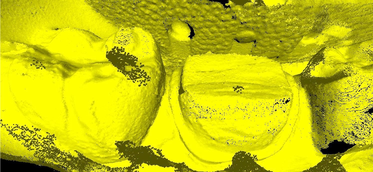 Objectives: Model scanning tends to miss crucial areas and certain detail – typically the interproximal regions but also the retracted gingival sulcus around a tooth preparation. To solve this, normally the gypsum model is physically trimmed and sectioned. The objective of this study is to evaluate the precision and the accuracy of the images obtained after processing together the scans of a PVS impression and the subsequent scan of the poured model. Methods: A high definition, new generation lab scanner (AADVA Lab Scanner 2, GC Corp, Japan) with hybrid-scan technology was selected for his evaluation. 20 realistic dental training models were used for this test. In each model, elements 11, 15 and 26 were prepared with similar technique and Chamfer preparation. The following steps were then executed: 1) PVS Impression of the model and direct scan of the impression; 2) Pouring of the impressions and scan of the gypsum models; 3) Scan of the training model and 4) Removal of the prepared teeth and the adjacent integral teeth for individual scan; 5) digital placement of scans obtained at step 4 back in the arch from 3, in order to produce a gold standard; 6) Creation of a hybrid using (1)+(2) and measurement of the deviation from each individual prep and variations. Results: The model scan (2) missed approximal and subgingival areas, while the impression scan (1) often missed inciso-palatal areas. The hybrid scan demonstrated to be able to recreate details and missing parts. The individual mean deviations from the gold standard teeth was <5 microns. Conclusions: The hybrid scan obtained by the tested scanner demonstrated to reproduce more significant and precise details in respect to the ordinary model scan. This method allow a flexible alignment of the impression scan into the missing parts of the model scan, and this ensures high quality resurfacing.
