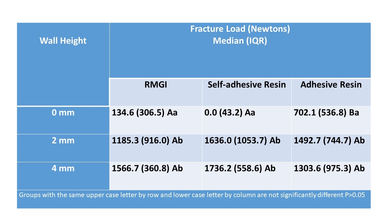 Objectives: Limited research has been published evaluating the failure of cubic zirconia crowns with non-retentive preparations. The purpose of this study was to evaluate the effect of axial wall height and cement type on the fracture load of cubic zirconia crowns. Methods: Ninety extracted maxillary human third molar teeth were prepared with standardized crown preparations with axial wall heights of zero, two, or four millimeters (n=10). The preparations were scanned and crown restorations were designed (Omnicam, Dentsply/Sirona). Cubic zirconia crowns (4Y-TZP, Katana STML, Kuraray) were milled (MCXL, Dentply/Sirona) and cemented with either a RMGI (RelyX Luting Plus, 3M/ESPE), self-adhesive resin (RelyX Unicem, 3M/ESPE), or adhesive-resin cement (Panavia V5, Kuraray). The specimens were stored for 24 hrs in 37°C distilled water, then subjected to thermocycling and cyclic loading. Each crown specimen was loaded to failure in a universal testing machine (Instron) at a 60-degree angle to the long axis of the tooth using a stainless-steel rod resting on the buccal incline of the palatal cusp. Data were analyzed with Kruskal-Wallis and Mann-Whitney U tests (alpha=0.05). Results: Significant differences in fracture load were found between groups based on wall height and cement type (p<0.05). See table. Conclusions: Regardless of cement type, the mean fracture load was significantly lower for the 0 mm wall height than with 2mm or 4mm wall heights, which were not significantly different from each other. Compared to the other cement types, the adhesive resin cement provided significantly greater fracture load with 0mm wall height.