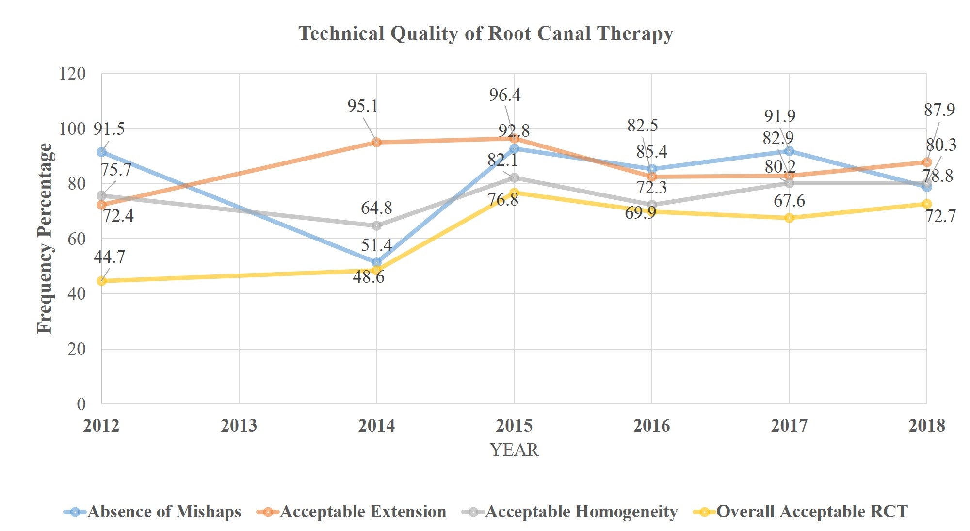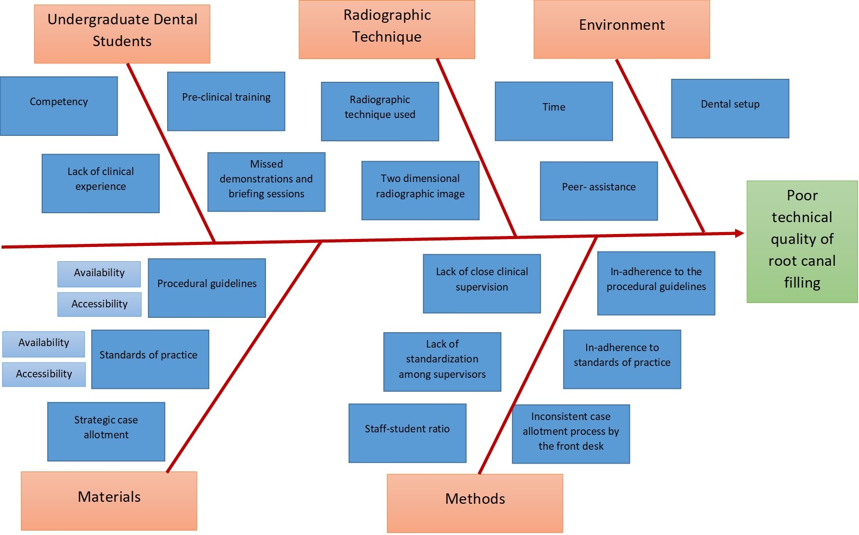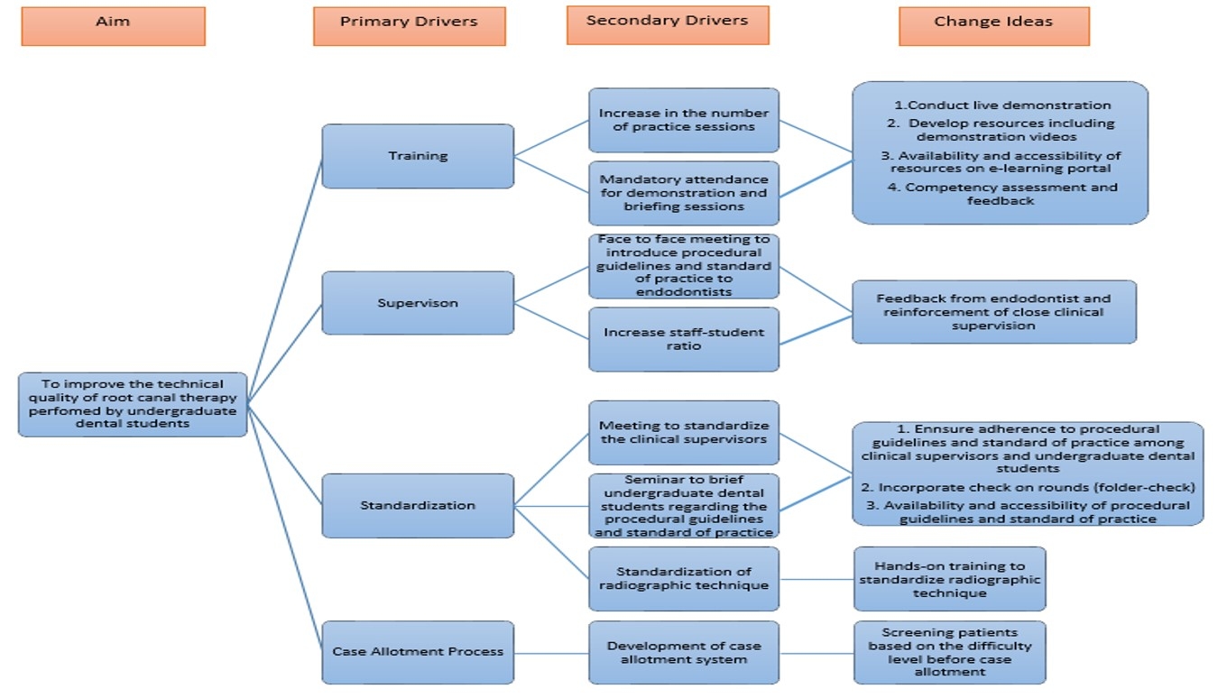 Objectives: Effect of IHI Quality improvement essentials toolkit in the endodontic clinical training and performance of dental undergraduates in root canal fillings and their outcome. Methods: Quality improvement essentials toolkit recommended by the Institue of Health Improvement (IHI) including cause and effect diagrams, key drivers’ diagrams, failure modes and effects analysis, process mapping and pareto chart were used to improve training, supervision, standardisation and case allocation processes for dental undergraduates from July 2012-June 2018. The technical quality of root canal fillings was assessed radiographically based on obturation density, extension of the root canal filling and absence of procedural errors.These ppatients were also recalled to assess the clinical, radiographic and overall endodontic success. Data were statistically analyzed using the chi-square test (p<0.05). Results: IHI Quality improvement essentials toolkit assisted in improving the clinical supervision and standardization by developing procedural guidelines, supervision guidelines and standards of practice, increasing the staff to student ratio from 1:10 to 1:6 and frequency of record checking from every six months to every three months. Training was improved by performing video assisted live demonstrations using a visualizer connected to a personal computer screen for a close-up view of all procedural steps shown by the demonstrator, ensuring their availability in the e-learning portal and increasing the training sessions. A Pareto chart identified the vital causes or technical errors such as ‘lack of homogeneity’ and ‘ledging’ seen in the performance of root canal treated teeth by dental undergraduates.This allowed the team to focus on these two ‘vital few’ errors and thereby improving endodontic training. Use of endodontic case difficulty assessment form by AAE assisted in the case allotment process to assign cases based on undergraduates' seniority and clinical competence.The performance of dental undergraduates in root canal fillings improved from 44.7% ito 72% (p<0.05) and overall endodontic success showed significant improvement from 50.1% to 66.7% (p<0.05). Conclusions: IHI Quality improvement essentials toolkit assist educators in identifying gaps, planning, implementing, evaluating, and thereby improving the overall process.