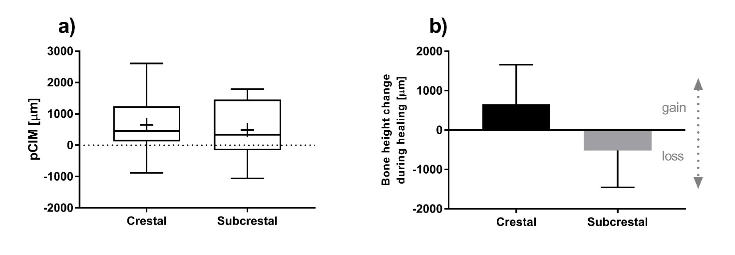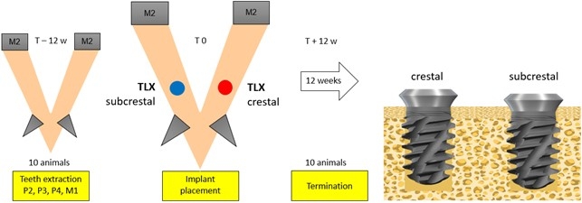 Objectives: The endosseous surface margin of transgingival implants is often placed subcrestally to increase primary stability via bone engagement with the flared implant collar. Some argue implant collar/bone engagement results in increased bone height loss. Modern transgingival implant (e.g. TLX) incorporate threads designed to better engage the bone at the time of placement, theoretically removing the need for subcrestal placement. The present study hypothesized that TLX implants placed 1.5 mm subcrestally would result in more bone height loss than the same implant place crestally. Methods: Insertion torque and ISQ were measured at the time of placement (10 minipigs; split mouth placement; n = 10) and various morphometric analyses were performed after a 3-month healing period. Results: Insertion torque and ISQ were significantly lower for crestally placed implants. However, relative bone height changes were found to be significantly higher for the subcrestally placed implants, with an average bone loss of 0.5 mm as compared to a bone gain of 0.7 mm for the crestally placed group. These bone height changes did not appear to have any effect on the overall osseointegration (as measured by BIC and fBIC), with both groups showing similar results. Conclusions: These results show that with the TLX implant, subcrestal placement led to inferior bone height maintenance compared to crestal placement. This combined with the increased primary stability coming from the high engagement of the thread design (as compared to more traditional TL implants), the authors propose crestal placement of TLX implants in healed sites.