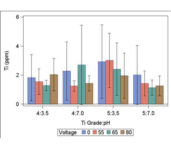 Objectives: The objective of this pilot study is to evaluate the presence of Titanium ions leakage from various anodized titanium in different pH environment. Methods: Eighty Commercially pure titanium (cp-Ti) and titanium alloy (Ti-6Al-4V) samples were anodized at different voltages, in two different solutions mimicking clinical situations. The samples were divided into groups depending on variations of pH levels, grades of titanium commonly used in dentistry, and different anodization voltages (55 V, 65 V, 72-80V) utilized in implant dentistry for surface treatments. CpTi and Ti-6Al-4V alloy discs in 10 mm diameter and 1 mm thickness were used. The tests performed were in acidic artificial saliva iii (pH 3.5) and PBS (pH 7.4). The ions’ leakage was measured by inductively coupled plasma mass spectroscopy (ICP). The results were analyzed statistically using ANOVA and pairwise tests. A significant difference was accepted when p < 0.05. Results: there were no statistically significant differences between the leaked amounts based on voltage. However, there appears to be an interaction with the different Ti grades and varied pH solutions. (p = 0.01) A pairwise test was done to compare the clinically relevant interaction with the Ti grades and pH. This illustrates a significant interaction with grade 5 or Ti alloy and pH variables. (p = 0.008) Conclusions: Within the limitations of this pilot study, the ion leakage appears to be influenced by titanium grades and pH. Furthermore, anodizing at different voltages appears to not affect the ion release and one can conclude this surface modification procedure can be safely done.