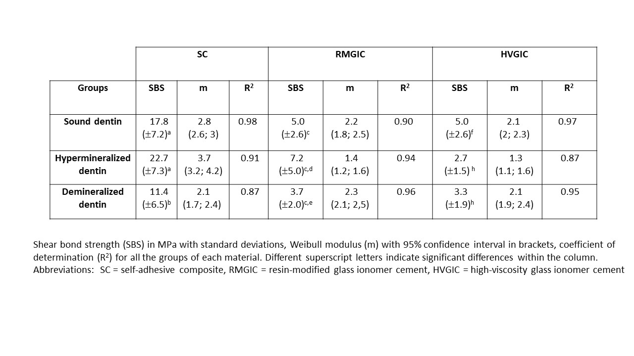 Objectives: This study aims to evaluate the effect that artificial hypermineralization and demineralization have on the shear bond strength (SBS) of three novel materials – a self-adhesive resin-based composite (SC), a resin-modified glass ionomer cement (RMGIC) and a high-viscosity glass ionomer cement (HVGIC) – to human dentin. Methods: A total of 180 human dentin specimens were randomly assigned to 9 groups (n=20). Either healthy, artificially hypermineralized or demineralized dentine was used as bonding substrate for each material. SBS was determined according to ISO 29022 after aging the specimens in distilled water (37°C) for 1 week, followed by fractographic analysis to determine the origin of fracture by light microscopy and analysis of bond morphology by scanning electron microscopy. One- and two-way ANOVA, Tukey’s post hoc test (α = 0.05) and Weibull analysis was used for statistical evaluation. Results: The univariate analysis confirmed a significant influence (p < 0.0001) of the material (ηp2 = 0.641), the dentin substrate (ηp2 = 0.155) and their combined effect (ηp2 = 0.173) on the SBS. Fractographic analysis revealed that adhesive fracture occurred in 74% (SC), 92% (RMGIC) and 96% (HVGIC) of the specimens. Bond reliability decreased in RMGIC and HVGIC and increased in SC when hypermineralized dentin was used. On demineralized dentin it decreased with SC and persisted with the other materials. Regardless of the dentin substrate, SC exhibited higher SBS values than RMGIC and HVGIC (p < 0.0001). The results are summarized in the table below. Conclusions: De- and hyper-mineralization appear to have a slightly detrimental effect on HVGIC SBS values. In contrast, SC SBS values appear to be negatively impacted only by artificial demineralization, while RMGIC was more robust to changes in dentine conditions. Changes to the degree of dentin mineralization display a significant effect on the bond reliability of all the studied materials.
