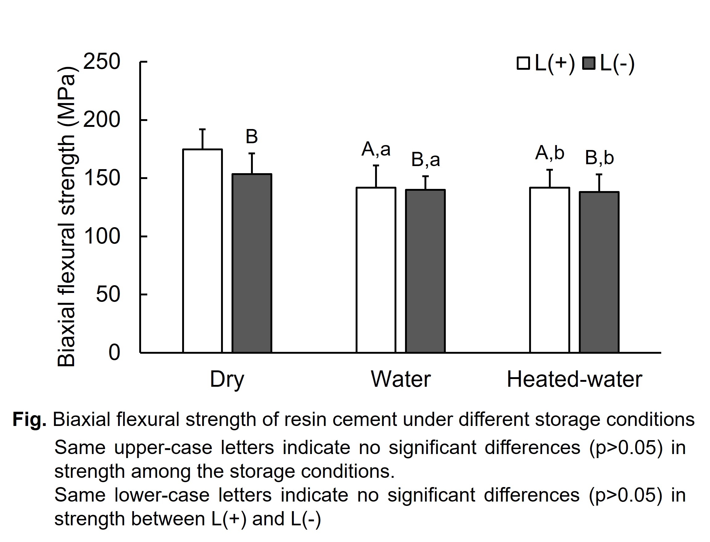 Objectives: This study examined the effect of specimen storage conditions on the biaxial-flexural-strength (BFS) of resin cement with or without light irradiation. Methods: A commercially available dual-cured resin cement (Panavia V5, Kuraray Noritake Dental) was examined. Disc specimens were fabricated using vinyl chloride mold (15-mm diameter, 1-mm thickness) and light cured for 27s each at the top and bottom surface by a curing lamp [light-cured group, L(+)]. The specimens without light irradiation [self-cured group, L(-)] were prepared in the darkroom. All specimens were stored at 37±2°C and 95±5% relative humidity in the container. One hour after the start of cement mixing, specimens were removed from the mold. The specimens were stored in either dry conditions with silica gel (Dry), deionized water at 37±2°C (Water), or Soxhlet extractor using deionized water at 90±5°C (Heated-water) up to 24 hours after start of cement mixing (n=10 each). The BFSs of specimens after storage were determined using the universal testing machine (3366, Instron) at a crosshead speed of 1.0mm/min at room temperature. The results were analyzed using Two-way ANOVA/Sheffé's test (α=0.05). Results: Measured BFSs are shown in Fig. ANOVA indicated that there were significant effects of specimen storage conditions and light irradiation on BFS (p<0.05). For L(+), Dry specimens had the greatest BFS among all storage conditions (p<0.05). For L(-), there were no significant differences in BFS among the storage conditions (p>0.05). The BFSs of L(-) specimens were lower than those L(+) specimens in Dry (p<0.05). No significant differences in BFS were found between L(+) and L(-) specimens for Water and Heated-water groups (p>0.05). Conclusions: Although the BFS of light-cured group reduced under the conditions with water, those of self-cured group were less affected by the storage conditions under the present experimental conditions.