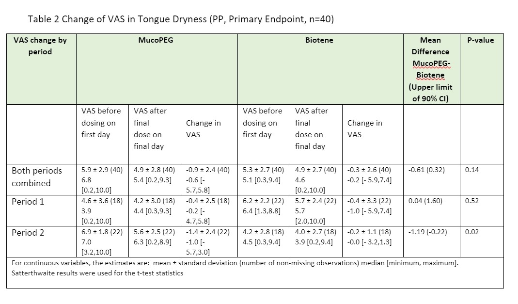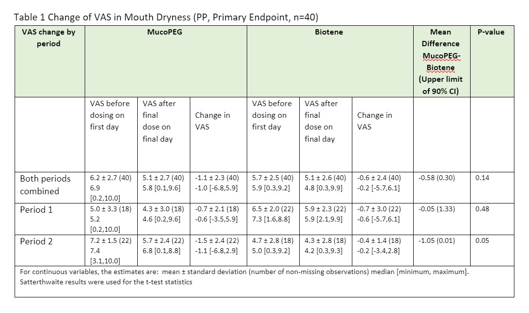 Objectives: The primary objective of this study was to evaluate the effect of MucoPEGTM in relieving xerostomia, relative to Biotène® Dry Mouth Gentle Oral Rinse. Effects of both oral rinse products were assessed using the Visual Analogue Scale (VAS) and Dry Mouth Relief Questionnaire. Methods: Forty-two xerostomic subjects were enrolled at 2 sites using an open-label randomized cross-over design. Subjects were randomized into 2 groups, each using Biotene and MucoPEG for 2 weeks in opposing order, with a one-week washout period. Subjects completed VAS, dry mouth relief questionnaires, dry mouth Product Performance and Attributes Questionnaire (PPAQ), and Post-Product Use Questionnaire (PPUQ) at multiple timepoints to assess their subjective feelings of oral dryness. This study was approved by Tufts University Health Sciences IRB (Tufts) and Advarra CIRB (Colorado). Results: MucoPEG showed greater improvement in symptoms of mouth dryness compared to Biotene (p-value of VAS; for Mouth dryness: 0.05, Tongue dryness: 0.02) in subjects under Period 2, and greater improvement in symptoms (p-value of VAS; for Mouth dryness: 0.14, Tongue dryness: 0.14) for both periods combined. (Tables 1 and 2). MucoPEG demonstrated non-inferiority to Biotene but failed to demonstrate superior efficacy due to lacking enough power to confirm statistical significance. Conclusions: Xerostomic patients need more effective and long-lasting products to relieve their symptoms and reduce their risk of oral diseases. MucoPEG showed effectiveness at improving some symptoms of xerostomia in this xerostomic population. Larger studies are needed to attain more conclusive results. This study was funded by SunBio, Inc.