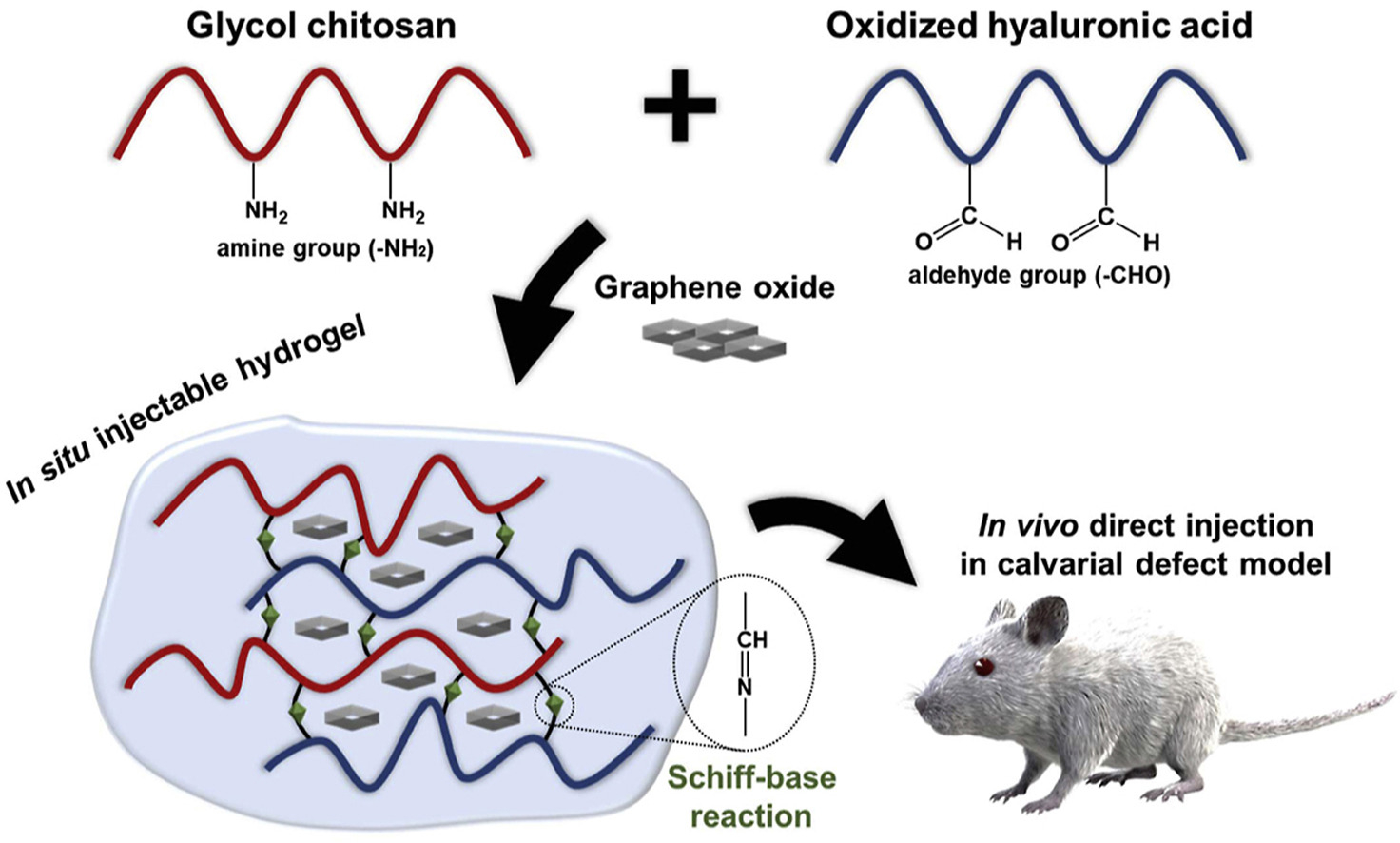 Objectives: Bioactive molecules such as graphene oxide (GO) incorporated hydrogels have received great attention and have shown excellent potential for use in the field of bone tissue engineering due to their unique osteogenic functionalities. However, current hydrogel systems are limited in their ability to provide an appropriate amount of GO and stem cells to the lesion area as well as inconvenient transplantation processes. For instance, it has only been applied using thermosensitive injectable hydrogels. Methods: To overcome this issue, we developed a GO-incorporated injectable hydrogel system by using glycol chitosan (gC) and oxidized hyaluronic acid (oHA). Chitosan (CTS) is the second most abundant natural polysaccharide and has many valuable characteristics including biodegradability and biocompatibility, HA has also shown potential for use in the biomedical engineering area. In this study, we prepared oHA to form a hydrogel through simple and facile solution mixing without using any additional chemical or radiological crosslinking. Results: Through oxidation, aldehyde groups were introduced onto the HA. Blending this with gC allowed for the formation of an aqueous hydrogel matrix. Physico-chemical characterization demonstrated that the gC/oHA/GO hydrogel matrix exhibited robust mechanical properties and stability. The gC/oHA injectable hydrogel could easily modulate the GO content and had robust mechanical properties with improved stability. As an in vitro assessment, GO-incorporated injectable hydrogel exhibited very little toxicity, but showed excellent osteogenic activity. This was confirmed by both in vitro and in vivo assessments. There results showed that GO-incorporated injectable hydrogels enhanced bone tissue regeneration as compared to control injectable hydrogels. Conclusions: Therefore, our results indicate that our injectable hydrogel system could be used for delivering GO. This material may serve as an excellent tissue scaffold for use in treating bone defects. This preliminary study will pave the way for these future investigations.