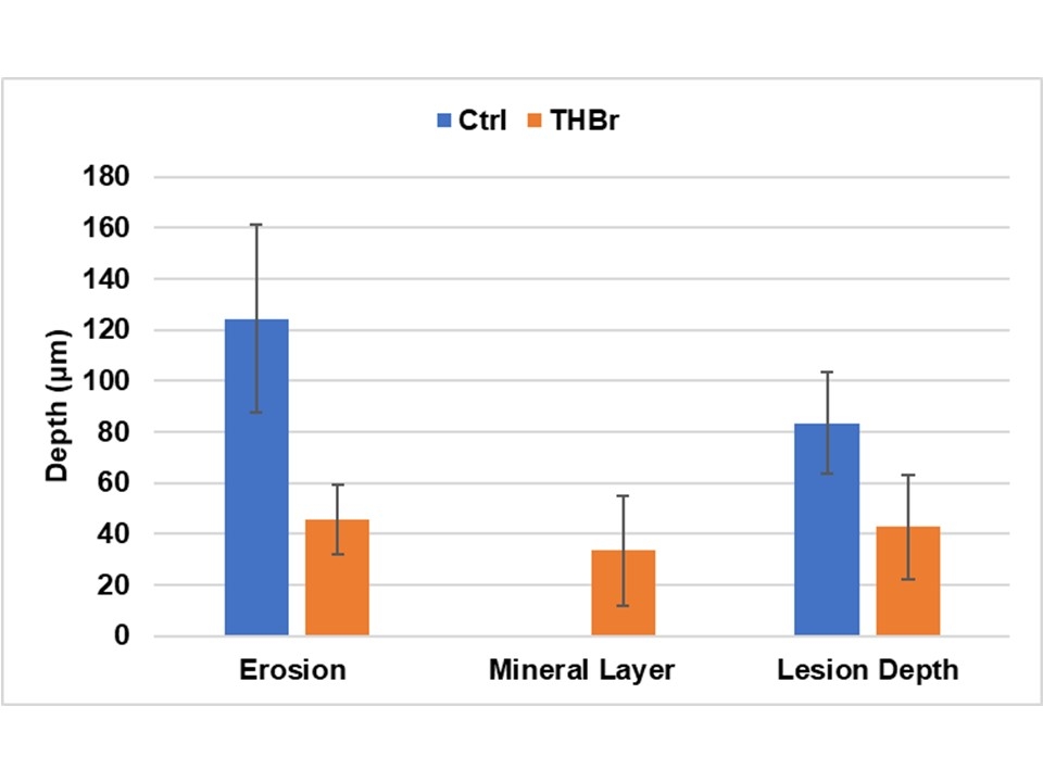 Objectives: The objective of this study was to determine if 300ppm theobromine has the ability to prevent enamel erosion and/or to prevent lesion progression. We hypothesized that a 300ppm theobromine rinse would prevent enamel demineralization and erosion compared to a non-theobromine rinse. Methods: Human enamel samples were cut into (2x2x1)mm blocks and mounted on plastic blocks. The natural surface of each sample was bisected into a lacquer protected and a non-treated area. The samples (n=10/group) were placed in a modified Featherstone model mouth system that simulated a realistic salivary flow with 3x/day lactic acid challenges. During the 5-day trial, the test group (THBr) received a 2x/day 300mmol theobromine rinse and the control group (Ctrl) received a water rinse 2x/day. The enamel samples were then cross sectioned, microscopically imaged and analyzed for erosive loss and lesion depth using Image-J software. Results: In this mouth model 2x/day exposure to a rinse of 300ppm theobromine significantly reduced the amount of enamel erosion {THBr=46±14μm vs Ctrl=124±37μm} at p<0.0001; and also significantly reduced the lesion depth {THBr=43±20μm vs Ctrl=83±20μm} at p=0.0003. For the THBr samples only, a mineralized layer 33±22μm thick was observed at the surface of the lesion. Conclusions: The data supports our hypothesis that the theobromine rinse has a significant protective effect on the demineralization of enamel. Further studies are needed to confirm these results and to analyze the composition of the mineralized layer observed on the surface of the lesion.