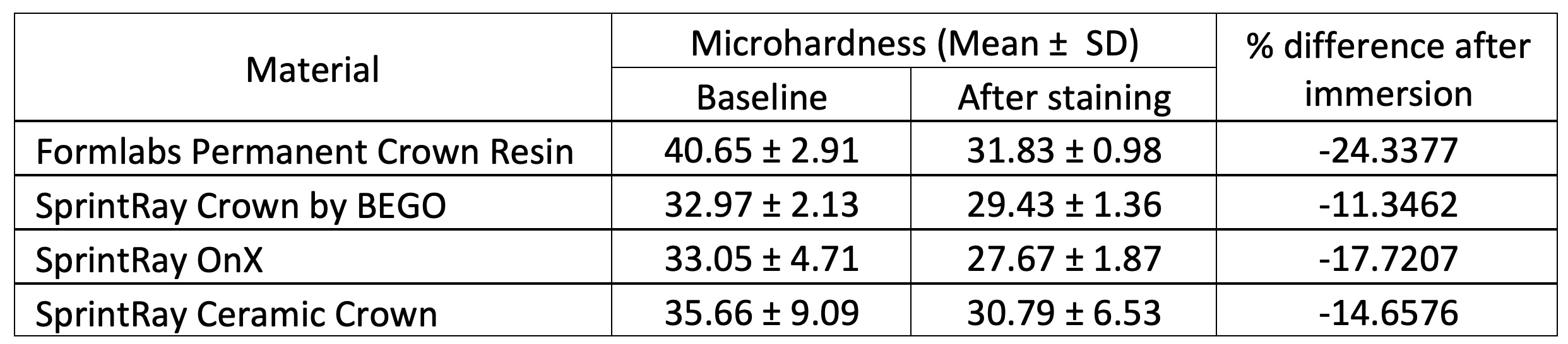 Objectives: To measure changes in surface microhardness of four 3D-printed resins following six days of immersion in liquid. Methods: Four 3D-printed dental resins were used to fabricate 10mm x 2mm disks: Formlabs Permanent Crown Resin (Formlabs, Somerville, MA), SprintRay Ceramic Crown (SprintRay, Los Angeles, CA) SprintRay Crown by BEGO, and SprintRay OnX. Samples were printed following manufacturer instructions for printing and post-print processing. Printed samples were stored at approximately 25°C for up to ten days before wet grinding/polishing through 1200-grit paper (AutoMet 250 Grinder/Polisher, Buehler, Lake Bluff, IL). Surface microhardness values of each sample were measured using a Wilson VH1102 Knoop hardness tester (Buehler). Following baseline testing, samples were immersed in red wine (37°C) for 6 days, rinsed with RO water, and hardness values were measured again.