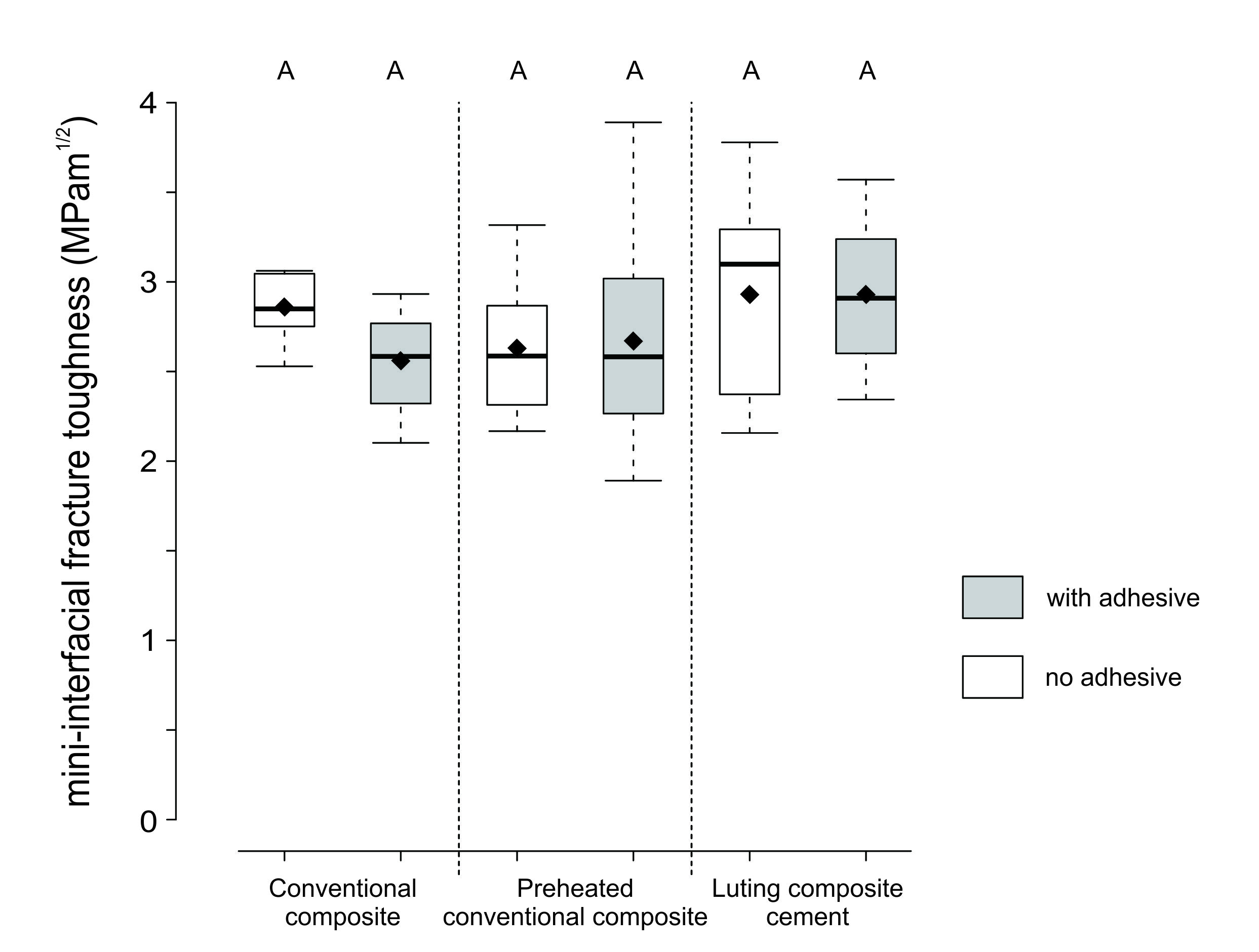 Objectives: This study aimed to evaluate the interfacial fracture toughness of lithium disilicate glass-ceramic surfaces treated with varying concentrations of hydrofluoric acid, along with the application of an additional hydrophobic resin and different types of composite cement. Methods: A total of forty-eight blocks of lithium disilicate glass ceramics were prepared and cut in half. Twelve distinct surface preparation methods were employed, which included treating the surfaces with 5% and 9.5% hydrofluoric acid (HF) for 20 seconds. The treatments were conducted with or without additional hydrophobic resin and included different types of cement: conventional composite, preheating composite, and luting composite cement. The bonded ceramic blocks were stored in artificial saliva for one week. Subsequently, the mini-interfacial toughness (mini-iFT) was measured to assess the bonding effectiveness. The data were analyzed using a two-way ANOVA with a significance level set at α=0.05. Results: The mini-iFT of ceramic surfaces treated with either 5% or 9.5% hydrofluoric acid showed no significant difference (p=0.538). For the 5% HF treatment, no significant differences were observed concerning the additional hydrophobic resin (p=0.45) or the type of cement used (p=0.08). However, with the 9.5% HF treatment, significant results were noted in relation to the type of cement used (p<0.05) and the interaction between the additional hydrophobic resin and the type of cement (p<0.05). Besides, the additional hydrophobic resin decreased the mini-iFT when the 9.5% HF was applied in conjunction with luting composite cement. Conclusions: The use of additional hydrophobic resin did not enhance the mini-iFT in the groups treated with composite or preheated composite cement. In fact, the presence of the additional hydrophobic resin negatively impacted bonding effectiveness when using 9.5% HF with luting composite cement.