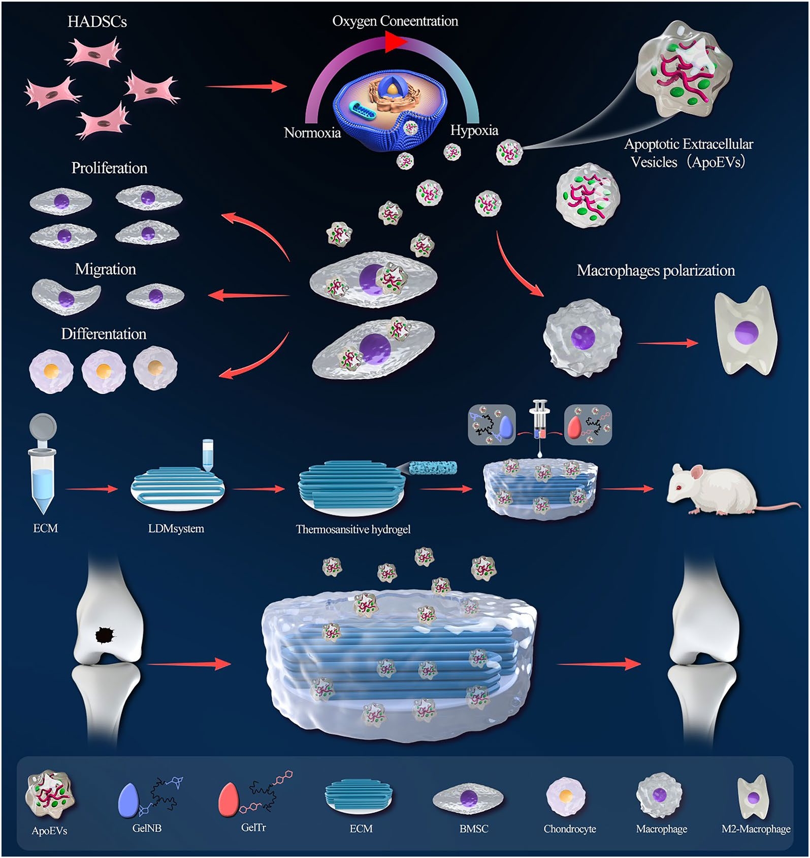 Objectives: Due to the unique structure, articular cartilage cannot undergo self-repair after injury, causing a difficult problem in the field of sports medicine. The objective of this study is to explore whether the apoptotic extracellular vesicles (ApoEVs) derived from MSCs cultured under hypoxic conditions (hypoxic apoptotic EVs [H-ApoEVs]) exert greater effects on cartilage repair than those cultured under normoxic conditions. Moreover, a carrier is developed, and the delivery efficiency of H-ApoEVs into the joint cavity for osteochondral regeneration is investigated. Methods: First, MSCs were transplanted into a rat osteochondral defect model, and their fate was observed. Then, human adipose-derived MSCs were cultured under normoxic and hypoxic conditions, following the induction of apoptosis, ApoEVs extraction, BMSC proliferation and migration, chondrogenic differentiation, and macrophage polarization. Next, miRNA sequencing and proteomics analysis of H-ApoEVs and ApoEVs was performed, and mRNA sequencing on BMSCs was conducted after treating with different ApoEVs. Finally, a carrier composed of a click-chemistry crosslinking gelatin matrix and 3D-printed cartilage extracellular matrix scaffold was developed to deliver H-ApoEVs into the rat osteochondral defect model. Results: In vitro cell proliferation and migration experiments demonstrated that H-ApoEVs enhanced stem cell proliferation, migration, and bone marrow-derived macrophages (BMDMs) M2 polarization compared to ApoEVs. The 3D-printed ECM scaffold provided mechanical support and created a microenvironment that was conducive to cartilage regeneration, and the H-ApoEVs further enhanced the regenerative capacity of endogenous stem cells and the immunomodulatory microenvironment of the joint cavity; thus, this approach significantly promoted cartilage regeneration. Conclusions: In conclusion, this study confirmed that the strategy to complex hypoxia-MSC-derived ApoEVs in a click-chemistry crosslinking gelatin matrix / 3D-printed cartilage ECM scaffold represents a promising approach to promote cartilage regeneration.