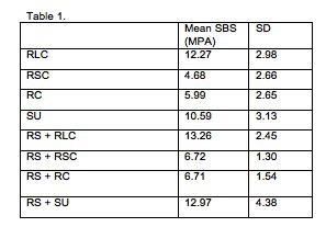 Objectives: This study investigates the effect of pretreatment of the dentin surface with a silver fluoride-potassium iodide product, Riva Star (RS, SDI). On the shear bond strength (SBS) of a conventional-cured glass-ionomer, a resin-modified glass-ionomer, a resin-modified glass-ionomer cement, and a conventional resin bonding material. Methods: After IRB approval, 20 extracted human molars were embedded in epoxy resin and sectioned to dentin with a slow speed diamond saw. The specimens were divided into 4 groups and 15 specimens were used for each test(n=15). The following test groups were conditioned per manufacturer’s instructions: Riva SC (RSC, SDI), Riva LC (RLC, SDI), Riva CEM (RC, SDI) and Scotchbond Universal™(SU, 3M). Dentin was pretreated with RS before application. The bonding surface was delineated by a 3.5mm hole in tape and a plastic tube (7mm diameter, 3mm height) for placement of the glass-ionomer or adhesively bonded composites. SBS testing was performed using a universal testing machine (Instron™ 5942). The SBS was determined by dividing the maximum breaking force divided by the bonding area. Results: Mean SBS and standard deviations for all test groups are listed in Table 1. There is no statistically significant difference in SBS between RLC and SU and between RSC and RC. A statistically significant difference in SBS was determined between RSC/RC compared to RLC/SU. With the pretreatment of RS, no statistically significant difference in SBS was determined for RLC, RC, and SU. A statistically significant increase in SBS was determined for RS+RSC compared to RS alone. Conclusions: Pretreatment of dentin with Riva Star does not affect the SBS of RLC, RC, and SU. An increase in SBS was determined with the use of RS+RSC, which may be due to the use of 37% phosphoric acid before RS application compared to the use of a polyacrylic acid conditioner with use of RSC alone. Results indicate that RS does not decrease dentin SBS.