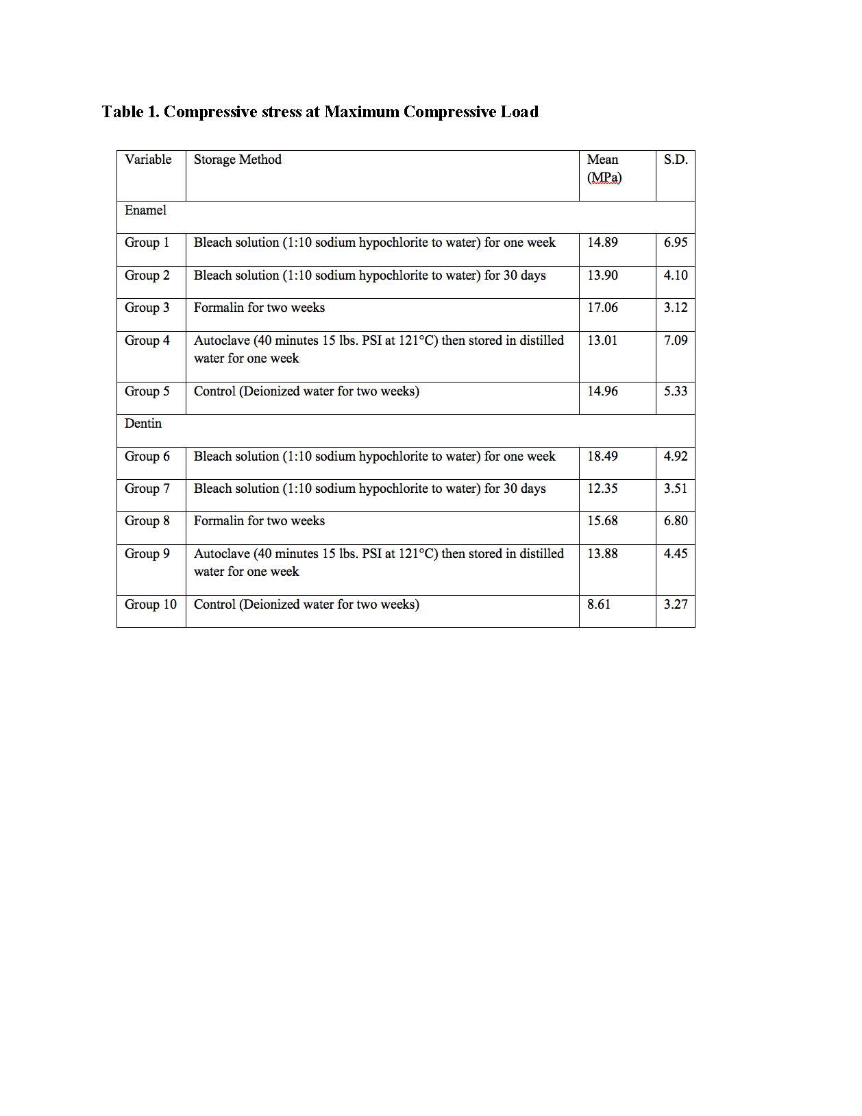 Objectives: Test the effects of storage methods on extracted teeth used for shear bond strength (SBS) tests of bonded composite to dentin and enamel. Methods: Extracted human teeth were used for enamel and dentin samples which were divided into ten groups (n=8 per group). Groups were stored according to the Centers for Disease Control and Prevention (CDC) sterilization and storage methods as well as an additional control group (see Table 1). Length of storage time was determined based on previous literature and educational standards. Enamel specimens (groups 1,2,3,4,5) were etched for 30 seconds, dentin specimens (groups 6,7,8,9,10) for 15 seconds (Ultra-Etch®, Ultradent), and then rinsed. Adhesive (ExciTE® Total-Etch Adhesive, Ivoclar Vivadent) was placed according to manufacturer’s instructions. Composite (Filtek™ Supreme Ultra Universal Restorative, 3M ESPE) was added and light-cured for 30 seconds (DEMI™, Kerr). Samples were stored in deionized water for 24 hours. SBS was tested using a universal testing machine (Instron® 5566A, Norwood, MA); crosshead speed moved at 5mm/min until failure. One-way ANOVA and Tukey’s HSD were used for analysis. Results: Means and SDs for compressive stress at maximum compressive load were calculated (Table 1). The enamel group difference was not statistically significant (p-value=0.668). The dentin group difference was statistically significant (p-value=0.003), with differences between groups 2 and 10 (p-value=0.002) and between groups 4 and 10 (p-value=.040)(Table 1). Conclusions: Storage method did not impact the SBS results for enamel. For dentin the mean of group 10 (deionized water) was significantly less than groups 6 and 8 (bleach for 1 week and formalin). This may have an impact on future studies, as storage methods did not appear to negatively affect the SBS results on enamel, however, there was a difference in SBS results for the dentin samples.